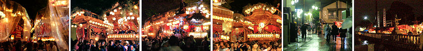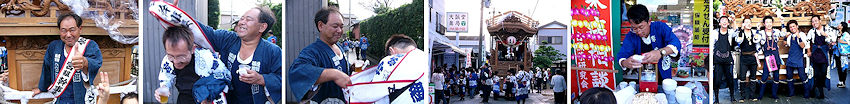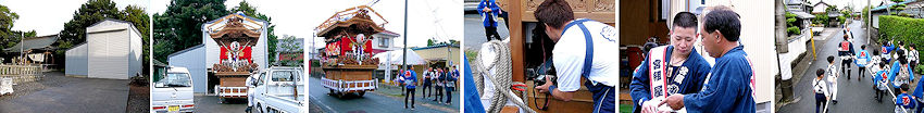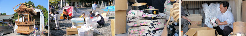 2003/09/28_朝から宮組恒例の注連縄作り、藁にまみれて体が痒かった。みんなのおかげて立派な注連縄が出来上がり幹事長も一安心、昼飯も美味い。 2003/09/13_浜北の宮口祭典へ土日行ってきました。見所は20時頃からの坂上げ。21時半頃までには境内に9台の屋台が勢揃いします。翌日は先代二福神車の見学もさせていただきました。 2003/09/12_にしても暑いですねぇ。風呂上りのビールの美味いこと。本当にあと一ヶ月で祭りが来るんでしょうか。「トピックス」を更新。 2003/09/06_宮組公民館にて毎年恒例のお囃子練習が始まりました。遠州横須賀/雅會さんが手本を見せていただきます。目標は大間・屋台下・馬鹿囃子の3曲、残暑厳しい中でのスタートみんな頑張れ~! 2003/08/24_9時から屋台小屋を開けて虫干し開始。シートをとって清掃、大事な車軸のグリスアップ。それと来月から始まるお囃子練習に備えて小太鼓も準備です。若い衆が手際よくやってくれたので昼前に終了、お疲れ様でした。 2003/08/23_買ったばかりのデジカメFZ1を携えての二俣祭り。お目当ては白山連、いい屋台です! 2003/08/19_連休が終わってから晴れても遅すぎる。夏休みを返せー。せめて今週の二俣まつりと福田の花火に期待しています。 2003/08/10_ついにデジカメ購入。Panasonic DMC-FZ1というズームの効く200万画素でボディはシルバー。今まではフィルムカメラで撮ってお店に有料で現像に出してフィルムスキャナーで一枚ずつせっせとPCに根気よく取り込んでいましたが、現像不要のデジカメは超楽です。最初はこんなもので綺麗に撮れるのだろうか?