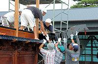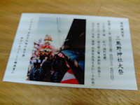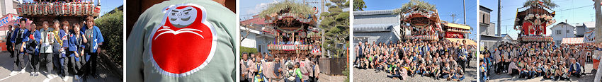 2009/12/30_映画「カールじいさんの空飛ぶ家」を観てきました。さすがピクサー面白い。子供らには不評でしたが、なんともいい感じの映画でした。 2009/12/26_今日は蟹忘年会、一年お疲れ様でした。 2009/12/25_メリークリスマス! 仕事納めで明日から冬休み、大掃除だぁ~。 2009/12/08_先月見せていただいた秋葉山上社に飾られている、重さ約1トンもある大注連縄の入れ替え設置作業を見せていただきました。秋葉山といえば山門も何年振りかに見学。火祭りは平日なので行けそうにありませんが。 2009/12/06_朝9時過ぎから防災訓練。皆で可搬ポンプの扱い方を念入りに勉強。 2009/11/22_現在制作中の秋葉山の大注連縄を制作元の許可を得て見学してきました。まずデカイ。一番太いところで自分の腰の高さまであります。見る角度によっては、アニメ「風の谷のナウシカ」に出てくる王蟲みたい。組み合わせてある1本でも福田の屋台用より太いんですよ。こんなのどうやって作るんだろうと思います。上社用と下社用を作っておられます。 2009/11/15_昭和31年に本町連屋台を改修したときの写真をご提供いただきました。「東屋台と本町連」のコーナーに追加。それから福田一番組/い組屋台の昭和31年創建初年度の記念写真も掲載させていただきます。ご協力ありがとうございました。天皇陛下御在位20年祝いの屋台ひきまわし奴連。 2009/11/08_グループホーム福田の家Pにて一番組/いちわ会さんのお囃子披露の様子を見学させていただきました。本格的に取り組まれていて見事です。 2009/11/07_カメラの福忠さん謹製の祭りカレンダーが今年も発売になりました。1部500円。旧福田町の祭り屋台をほぼ網羅されたようです。森町の西光寺境内で行われた第24回国民文化祭の第2部「江戸天下祭のお囃子」を見学。多くの人で賑わっていました。↓千葉の佐原囃子が素晴らしかった(携帯カメラで撮影)。 2009/11/06_マイケル・ジャクソンの映画を観てきました。馴染みのある曲ばかりで2時間あっという間、よかった。 2009/11/01_晴れの特異日のハズが生憎の空模様。久々のららぽーとでのんびりお買い物。「祭りの写真をできるだけ沢山載せてほしい」とのご要望もあり、なんとか頑張って編集作業です。 2009/10/23_やっと自分が撮った掛塚祭りビデオのUPがひと段落。映像はメモリーに記録されているのでパソコンへの取り込みは早いのですが、インターネット環境は未だADSL故UPに時間がかかります。1日3台分がやっとでした。さて次は福田の写真の整理か。ぼちぼちやります。2009/10/21_掛塚祭りの様子をUP。ビデオは内臓メモリータイプなのでパソコンへの取り込みが非常に楽になりました。一日撮り歩いても容量余裕+バッテリーも十分もつ。人間の方が先にバテてしまいます(汗)。 2009/10/18_朝は福田海岸清掃。この前の台風18号の影響か、かなりのゴミが散乱。拾い甲斐がありました。昼頃からのんびり掛塚まつりへ。何人かの知り合いにも会えて話ができ充実した時間を過ごさせていただきました。福田の祭りから新規投入のソニーのビデオとデジカメも要所で活躍してくれました。御仮宮まで見てバスで帰宅。今日でマムが閉店。 2009/10/17_所用で掛塚は行けず、18時から地元の祭り反省会。 2009/10/13_「遠州横須賀街道ちっちゃな文化展」のご案内をいただきました。10/23金・24土・25日なので天気がよければ行ってみようかなと思います。祭りの時とは違う雰囲気が楽しめそうです。そういえば金木犀が香り始めたような気がします。 2009/10/12_朝から快晴の片づけ日和。要領よく手際よく作業を終えて午前10時半には屋台小屋のシャッターを下ろして撤収。これから写真とビデオの整理です。祭り期間中一つだけ気になったこと、それは金木犀が全く香らなかったことでした。今年は遅いのかな?皆さんお疲れ様でした。 2009/10/11_ 午前中は奴連と。柿沢牛乳屋さんでお世話になりました。福田公民館北を東進、昼前に宮組のお囃子披露をみて恒例の合同写真。 2009/10/10_朝は曇っていたが次第に晴れ間が広がり、昨夜の雨で濡れた路面もすぐ乾いた。昼間は汗ばむ暑さで夜は肌寒い、歳で寒暖の差がこたえます。 2009/10/09_後から屋台小屋を開けて準備。太鼓を乗せて配線チェックのため照明を入れる。夕方から子供らも参加してバーベキュー。宮組の前夜祭を見て帰宅。天気予報に反して夜遅くに雨になった。 2009/10/08_心配された大型の強い台風18号はなんとか過ぎ去り、週末の天気予報は晴れマークが並んでいます。楽しい祭りにしたいものです。 2009/10/04_朝から快晴、屋台の飾り付けを行い後は祭り本番を迎えるのみ。沖の台風の進路と速度が気になりますが…「天狗連」は8月完成の屋台小屋立て替え祝い(屋台は制作元の安間工務店さんに保管されていたそうです)「港連」は敬老会のお祝い、「おかめ連」は恒例の屋台を見る会。 2009/10/03_名古屋まつり/旧二福神車展示を見に行ってきました。お目当ては栄の会場に展示されている旧二福神社(宮口の研精社)。約170年ぶ