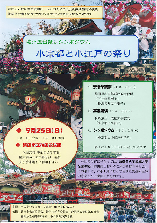 午後12時半開演、遠州を代表する静岡県指定無形民俗文化財のお囃子が披露されます 遠州横須賀 三社祭礼囃子 《 ご参考までに 》 午後2時から基調講演「小京都と小江戸」 午後3時15分よりシンポジウム「小京都と小江戸の祭り」 |