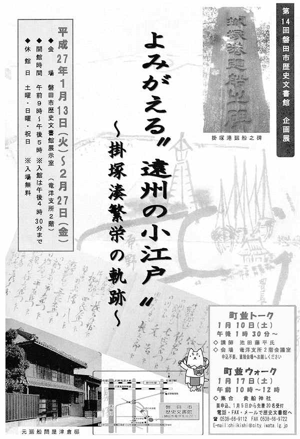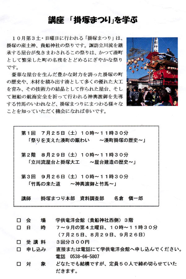 ※掲示板2015を時系列に統合再編集済み 2015/12/31_今年一年ホームページをご愛顧いただきありがとうございました。また来年もよろしくお願いします。なんだかんだで慌ただしく過ぎる大晦日。午後からはいつものごとく炬燵で御節料理に手を出しながらTVを観てのんびり。 2015/12/28_不要になった古いHDDを2つをトルクスドライバーで開けて中身を物理的に壊し、他の不要物と一緒に磐田市の処分場へ持込み。混んでいたので並んでなんとかやってきました。これでスッキリ。 2015/12/26_テレビ録画用の外付けHDDを物色していたところ手頃なモノを見つけたのでためしに購入。帰宅して繋いだらすぐ認識で即使用可能に。これで長持ちすればいいんだけど。 2015/12/20_長年慣れ親しんできたマクドナルド福田町店が今日で閉店。残念です。 2015/12/13_年賀状作りも失敗なく終わり年末に向けていろいろ片付いていきます。久々のららぽーとはクリスマス一色で賑やか。フードコートの東京池袋光麺でランチ、北海道物産展でラーメンを数種類買ってきました。 2015/12/09_NHKブラタモリ12/12「♯25日光東照宮」三猿や眠り猫の謎が解き明かされる?! 2015/12/06_みかんの美味しい季節になってきました。この週末は映画DVD「スターウォーズ」エピソード1~6までを順に一気にみてます。数年ぶりの見直しで意外と新鮮、3から4への繋がりも自然に受け入れられます。そこ兄妹、あんたら親子、C-3POとR2-D2は相変わらずとかよくわかるんですが微妙な矛盾点も…。友人に話題にしたら「俺スターウォーズ全く観たことないでわからんだよぅ」と言われ絶句、そんな人がいるのか。決めつけちゃいかんなと思いました。 2015/12/02_師走に入りました。今年も残すところあと僅か。大掃除や年賀状作成などやること目白押しです。つい数日前に名称変更した某コーナーですが熟慮の末「遠州の屋台祭り雑記帳」といたします。 2015/11/29_「遠州の屋台祭り」のコーナーを「遠州の屋台祭り見聞録」に名称変更しています。内容は相変わらずの祭り絵日記を継続。袋井市の名店・めん虎のカップ麺見つけたので買ってみました。なかなか美味いのでまた買ってもいいかなと思わせる味になってます。 2015/11/22_昨日は長野県諏訪市へ立川流彫刻を見学に行ってきました。福田には立川流彫刻はないためHP開設以来立川関係はとくに触れずにきましたが、カメラを買い替えたこともありテストも兼ての諏訪遠征でした。水野先生の講演も素晴らしくとても充実した一日でした。「墨守ではなく新規創出」に納得。余談ですが諏訪市博物館にある足湯は初体験。全身あったまります。あとやはり蕎麦が超美味かった~。 2015/11/20_「広報いわた」に掲載されている4コマ漫画「きょうも♪たのしっぺい」面白いですね。自分定番の豊浜ちとせ食堂中華そば、ホッとする味。 2015/11/15_心配された天気でしたが時間とともによくなり絶好のマラソン日和となりました。沿道で仮装をみながら楽しく見物。 2015/11/07_浜松のラーメン屋・麺屋破天荒風雅でつけ麺を食す。ここも友人から「つけ麺ならココ」と教えられ初めて行きました。麺がもちもちで触感◎ 2015/10/31_炬燵を出して冬支度を済ませて久々のららぽーとへ。リニューアルして新しくなったお店のメニューを試してみました。 2015/10/25_初めてビデオカメラを買ったのが1995年。その年に撮った掛塚祭りのHi8テープをPCへ取り込みYouTubeへUPしてみました。20年前も今と似たような撮り方で進歩がないんですがそれなりに楽しめます。 2015/10/22_長野県の諏訪市博物館で「諏訪の工匠・立川一門―社寺建築と山車彫刻」やってます。 2015/10/18_午前7時半集合で海岸清掃へ。けっこうゴミありました。終わって帰宅し身支度整えて掛塚屋台祭りへ。境内に屋台が並んだところからの見物です。 2015/10/11_宮組本部前で恒例の合同写真、昨夜からの雨が止まず傘をさしてなんとか撮影。馬…そんなこともありましたね。餅まきでは足元にきたのでつい欲が出てわりと拾ってしまったのですが腹掛けに入れてると負担になるので周りの人にあげてしまいました。 2015/10/10_中島稲荷神社は初めて通過、恒例の岸和田運輸北交差点は2年ぶりとなります。 2015/10/09_朝から諸々の準備で多忙。自宅の提灯と軒花を飾りつけ屋台用バッテリーを運搬し合間を見てなか幼稚園のお祭りごっこと屋台撮影行脚。昼飯は幸楽苑/鶏白湯らーめん美味かった~。 2015/10/04_朝から屋台の飾りつけをなんとか済ませてお祓いまでやって終了。あとは祭りを待つばかり。配布された屋台引回し説明書も皆で確認。週間天気も気になります。 2015/10/03_夕方から磐田市中泉の祭り見物を楽しみました! 2015/09/27_浜松市参野町新屋台を見学、午後から磐田市東新町/造立社の屋台入魂式をみてきました。袋井市北地区上久能/鳳凰車を譲り受けました。でも旧屋台はどうなるのか…気になります 2015/09/26_浜松市の自動車街にあるらーめん一刻堂で台湾まぜそばを食してきました。友人から「辛いよ」と言
