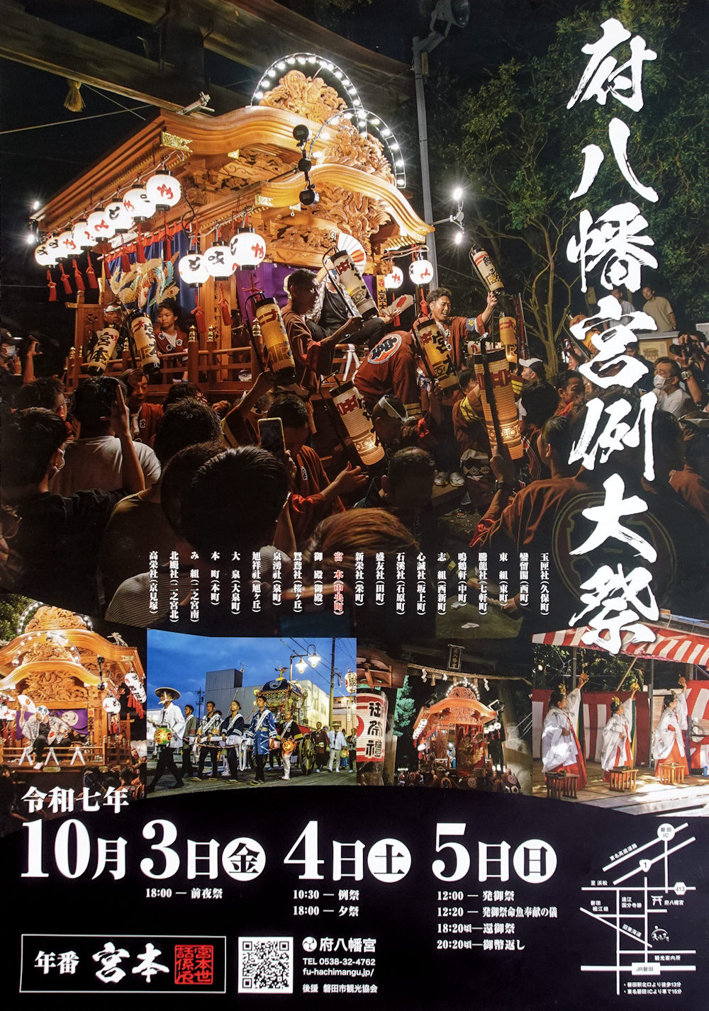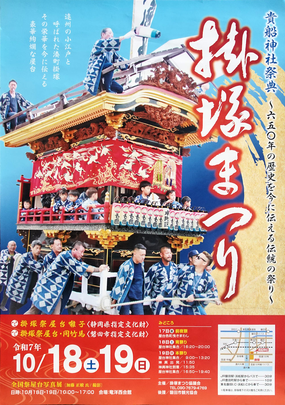 《新着順表示》 2025/12/31_今年もこのHPをご愛顧いただきありがとうございました。おかげさまで良い1年となりました。また来年もよろしくお願いします! 2025/12/13_浜松市三和町さんの屋台の欄間彫刻取り付けを見学させていただきました。5月の端午の節句の由来となる初めて見る図柄で、よく研究されています! 2025/12/06_昨年と今年撮った秩父の屋台彫刻から面白いことがわかりましたので、掛塚横町KMさんを訪ねてご報告させていただきました。長年の懸案に貢献させていただけたかなと思います。 2025/12/03_秩父祭へ行ってきました。気楽な一人旅で昨年に続き2回目ということもあり事前の下調べを入念に行い思い通りに行動することができました。天気は曇りで寒すぎず屋台を撮るには申し分なし。新たな発見も多々ありで充実の祭り見物、12/2約2万歩、12/3約1万8千歩でした。 2025/11/08_森のまつり2日目。祭典本部前から金森神社までみて鯛焼き買って帰宅。 2025/11/07_森のまつりをのんびり見物。今年の大河の蔦屋重三郎がありました! 2025/11/05_浜松市入野町田端の屋台解体作業を組の方々のご厚意で見学させていただきました。昭和22年建造の古い2層屋台で、老朽化から揺れが酷くなったそうです。 2025/11/01_遠州掛塚屋台まつりのページを作ってみました。長年撮り溜めた写真を貼り付けただけですが、撮れていない部位があり愕然としました。来年の課題です。 2025/10/19_朝の海岸清掃後はJRで蒲郡市の三河祭へ移動。念願の山車海中渡御を見ることができました。JR三河三谷駅―三谷温泉間は無料シャトルバスを利用。海岸までの長い階段は帰りに辛かった。 2025/10/18_午後から掛塚入り。明るいうちはデジカメで彫刻撮影、夕方からスマホで動画撮影となりました。一時雨が降りシートが掛けられましたがすぐ止み、境内ではのんびり屋台見物ができました☆ 2025/10/17_磐田市掛塚祭りの前夜祭へ行ってきました。横町出発からのんびり雰囲気を楽しむことができて満足。 2025/10/13_福田の祭りは金曜日晴れ・土曜日曇り後雨後曇り・日曜日曇りの天気。今年も沢山の方と話せて楽しむことができ充実した祭りとなりました。お疲れさまでした! 2025/09/28_映画「国宝」みてきました。余韻のあるうちに原作も読もうと単行本買ってしまいました☆ 2025/09/24_掛塚(かけつか)の祭りポスターをいただきました。秋めいてはきましたが、まだ暑い日が続き寒暖差で体調を崩しがちです。 2025/09/17_STINGのコンサートを観に名古屋IGアリーナへ。往年の名曲の数々、素晴らしかった! 2025/08/29_中泉の祭りポスターをいただきました。 2025/08/24_午後から久々の二俣まつり、ちょうど交差点で3台集まってました。次に貴布祢へ移動、浜北文化センターから出発するところに運良く間に合いました。とにかく暑いので屋台をじっくり見るというよりは動画を短時間で撮るだけになりました。 2025/07/31_浜松市浜名区_宮口の祭りポスターをいただきました。今年は有隣地区/井組が年番組になります。 2025/07/10_暑い日が続くので熱中症に気を付けています。熊笹団子、初めて食しました! 2025/07/02_浜松市浜名区_貴布祢神社祭典のポスターをいただきました。7月に入り夏祭りのシーズン到来ですね! 2025/05/15_浜松まつりの屋台と彫刻に昭和32年建造の本郷町屋台を追加したので1段増えています。彫刻師の考察も含め吟味した内容になりました。東田町屋台の腰彫り、和地山の脇障子を追加。 2025/05/06_三和町屋台のページに写真を追加。夕方からの屋台曳きまわしでなんとか後ろの鬼板・懸魚を撮ることができて一安心。 2025/05/05_快晴に恵まれた浜松まつりを3日間楽しむことができました。凧場は3日4日と通い勇壮な凧揚げを満喫、堤防からパノラマ撮影してみました! 2025/04/30_上野にある東京国立博物館の特別展「蔦屋重三郎 コンテンツビジネスの風雲児」をみてきました。江戸の多彩な文化に触れ大河ドラマの世界観がよくわかりました。 2025/04/28_袋井市の法多山で火渡りを体験したところ煩悩一瞬にして消え去り宇宙の真理を悟る…までには至りませんでしたが、とても清々しい気持ちになりました。2024年の法多山開創1300年記念事業で建立された八角堂もみて厄除け団子を買って帰宅。 2025/04/13_朝から生憎の天候でしたが三和町屋台のお披露目があり、屋台全体写真を撮らせていただくことができました。立派な屋台で5月の浜松まつりが楽しみです。 2025/04/05_遠州横須賀のお祭り、ちょうど囃子奉納をやっていました。今回はのんびりみて帰宅です。 2025/03/27_埼玉県秩父市で今年5月下旬に予定されている植樹祭に屋台が展示されます。 2025/03/22_浜松市三和町の屋台組立を見学させていただきました。正面柱間口5尺3寸御簾脇付き、前輪操舵・後輪ブレーキ装置付きの立派な屋台です! 2025/03/19_約20年ほど前に作った磐田市豊岡敷地/敷組屋台の紹介ページをリニューアル。以前からやろうと思っていてコツコツ進めてきました。それと浜松まつりの屋台と彫刻の相生町屋台ペー