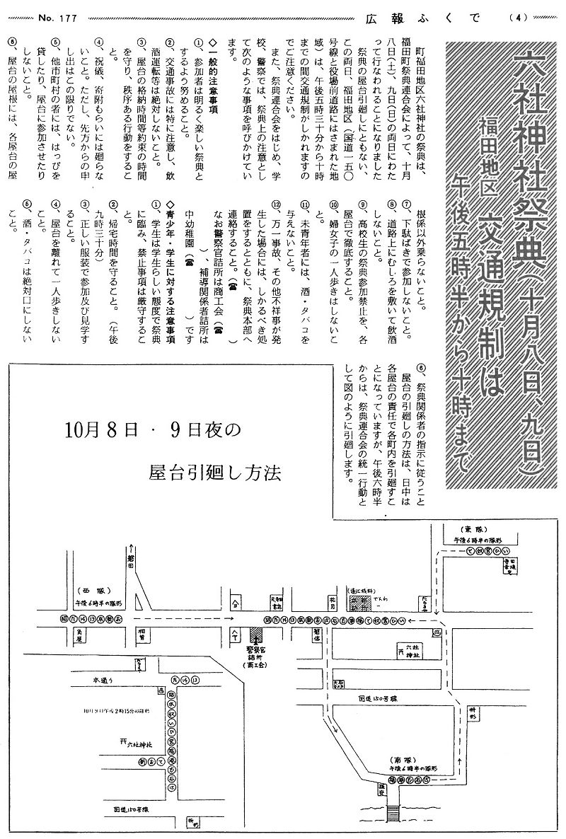 広報ふくで 昭和52年(1997)は石田組・十五番町が本格参加し始めた節目の年で、「統一行動」の表現もこの年には使われていたことがわかります。中川通り開通の10年前、長らく行われてきた福田の祭り隊形です。