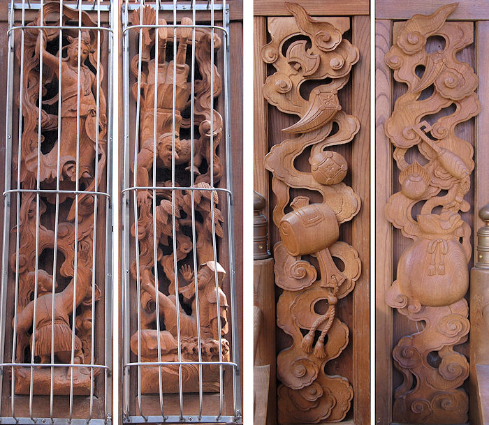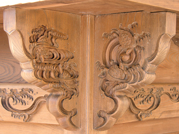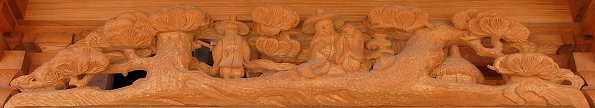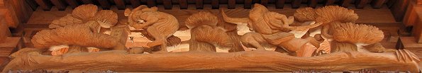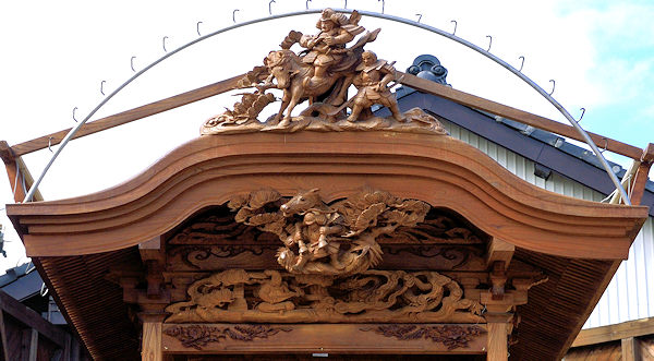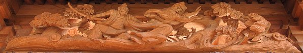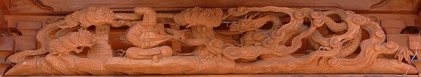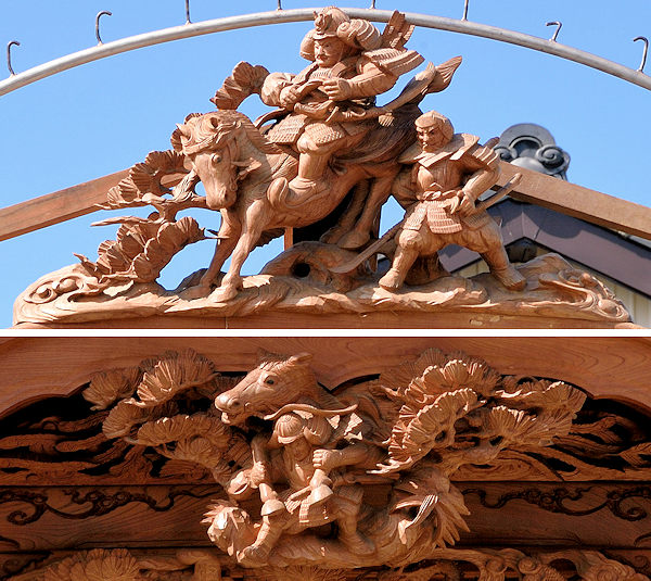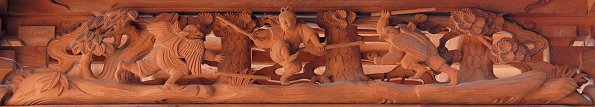 義経鵯越の逆落とし(奥出康運) 源義経軍は一ノ谷合戦において、海岸付近に布陣した平家軍を背後の崖上から奇襲し、意表を突かれた平家軍は混乱し大敗する。鵯越(ひよどりごえ)の逆落としである。このとき家来の畠山重忠は「大事な馬に怪我をさせるわけにはいかない」と持前の怪力で愛馬三日月の前肢を背負って坂を下ったとされる。 源三位頼政の鵺退治(奥出康運) 平安時代末期の伝説。近衛天皇の御代、京都内裏の清涼殿に毎晩黒雲が立ち込め、奇妙な鳴き声が響き渡り、天皇を恐怖に陥れていた。この怪異を退治するため、弓の名手・源頼政が選ばれる。ある夜、頼政は家来の猪早太と共に内裏へ向かい、黒雲の中に現れた怪物を山鳥の尾で作った矢で射抜いた。射落とされた怪物は「鵺(ぬえ)」と呼ばれ、猿の頭、狸の胴、虎の手足、蛇の尾を持つという奇怪な姿をしていたと伝えられる。この功績により、頼政は天皇から名刀「獅子王」を賜ったという伝承も残っている。 木鼻 (早瀬利三郎) 鳳凰 (以下浦部一郎) 平経正(たいらのつねまさ)は平経盛の長男。幼少期を仁和寺の覚性法親王のもとで過ごし、その間に琵琶と和歌の才能を開花させた。そして琵琶の名器「青山せいざん」を授かる。源義仲が挙兵した際、経正も立ち上がり、琵琶湖の竹生島へ必勝祈願に向かった。そこで神主に頼まれて琵琶を奏でると、白龍が現れたという伝説が残っている。 藤原俊成と平忠度 藤原俊成(ふじわら‐の‐としなり) 常磐御前雪行 平治の乱に敗れて源義朝が敗死し、常磐御前は平清盛の追手から逃れるために厳冬降りしきる雪中を、7歳の今若(阿野禅師 全成),5歳の乙若(円成),生後間もない乳飲み子の牛若(義経)の3人の子供を連れて都落ちする。 平維茂の鬼女退治 能。観世信光作。平維茂が戸隠山へ紅葉狩りに訪れた際、更科姫(さらしなひめ)という姫が催す酒宴に出くわす。維茂は勧められるままに酒を飲むが、やがて更科姫は正体を現し、鬼女となって酔いつぶれた維茂に襲いかかる。しかし維茂は持っていた名刀・小烏丸の功徳により危機を逃れることができた。 平忠盛と油坊主 平忠盛(たいら‐の‐ただもり) 鳳凰 羽衣伝説/久米仙人 宝尽くし 久米仙人(くめのせんにん)は、欽明天皇の時代に葛城の里で生まれたとされる伝説上の人物である。竜門岳で修行を積み、神通飛行術を習得した。ある日、久米川で洗濯をしていた若い女性の白いふくらはぎに心を奪われたことで神通力を失い、空から墜落する。やがてその女性と結ばれ、仙人の道を離れて人間としての生を歩んだ。 波に亀(小池佐太郎作) 備考 2000/05/27小池工務店により解体修理 新道とは? |