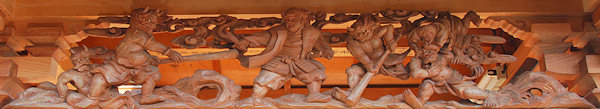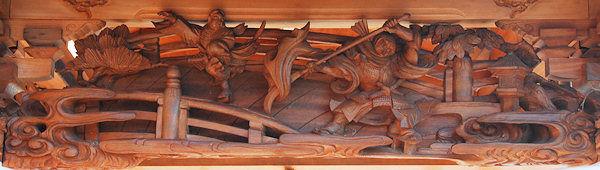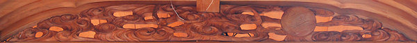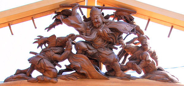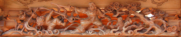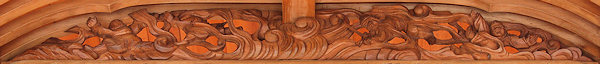 天幕 波濤霊亀之図 日本の祭礼の中で、鉾や山車を飾る幕によく用いられる意匠に四神文がある。源流を辿れば、四神すなわち東の青龍・西の白虎・南の朱雀・北の玄武で、朱雀は鳳凰、玄武は亀と蛇の合体の姿で表現された。この思想は中国漢代に起こるが、もと四方の星宿を動物に見たててつくられた想像上の動物である。また、四神を四霊ということがある。四霊について「礼記」礼運に麟・鳳・亀・龍の四種をいうとあるが、日本的表現のイメージとは厳密に一致しない。この四神思想は、思想史的にまた美術的にみて、その後の中国にとって重要な意義をもっているといえる。 |