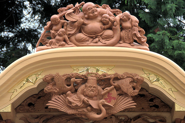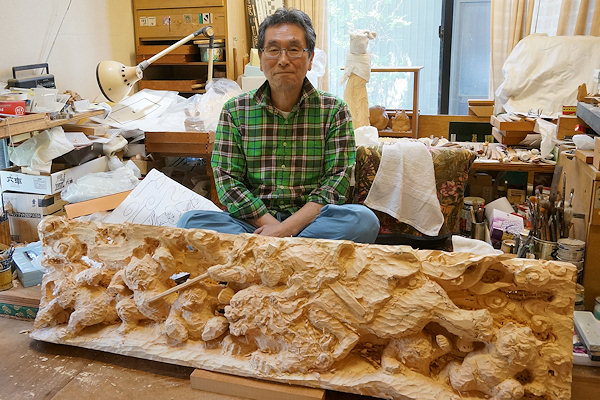 「浜北へきて2年ほどのち、浜北市根堅の大工・伊藤肇(いとうはじめ)さんが訪ねてきて屋台彫刻を手掛けるようになりました。そこからの18年間はほぼ毎年屋台の仕事をしました。2年がかりのもありましたので15台ほどになります。それから平成5年完成の地元中瀬6区の屋台を、同じ地元・大城総建さんが手掛けることになり、その彫刻を任されました。その後笠井、中瀬8区、同4区など計19台ほど手掛けてきました。屋台の仕事は納期がありますが仏像の仕事はこちらに任せていただくのがほとんどです。よって屋台の仕事に合わせてペース配分し両立させています。」