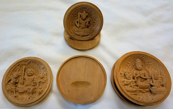 ↓「これは携帯を目的とする香合仏(こうごうぶつ)。念持仏(ねんじぶつ)ともいいます。材料は白檀。立てて拝めるよう蓋の裏に工夫があります。」