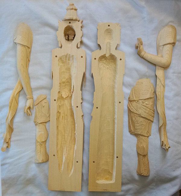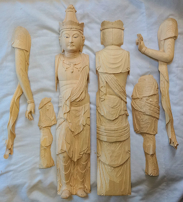 「仏像作りは寄木が基本です。材料は尾州桧を用いるんですが、こんな風に分割して作り後で貼り合わせます。もちろん木目を合わせて綺麗に仕上げます。」