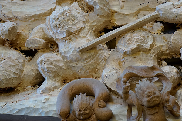 「欄間の図柄は鍾馗の鬼退治。並べて置くとわかるかと思いますが、以前制作した風神・雷神といま彫っている鬼の表情のつくり方は基本的に同じです。長年仏像等で培ってきた表現を屋台彫刻にも生かしています。」