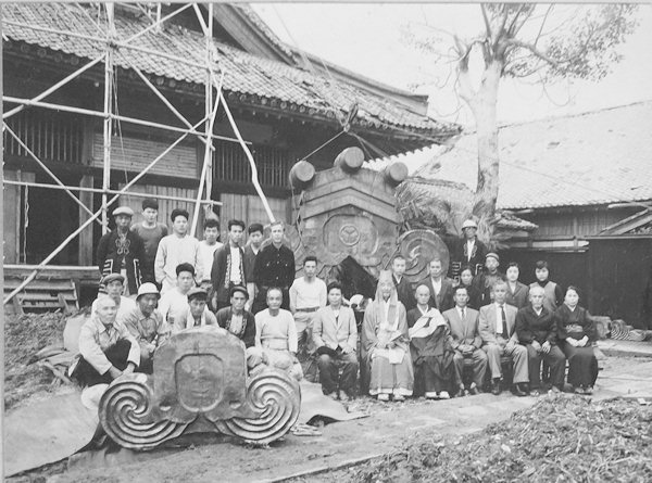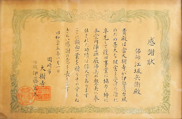 昭和34年(1959)の伊勢湾台風で被害を受けた名刹・大樹寺の修復を、日頃懇意にしている御住職から相談された。そこで兵衛さんは屋台で繋がりのある遠州掛塚横町の堂宮大工・平野孝頭領に修理を依頼。平野頭領は一門を引き連れて修理にあたり無事復興を果たした。御住職は兵衛さんの尽力を称え、記念の感謝状と写真を贈った。