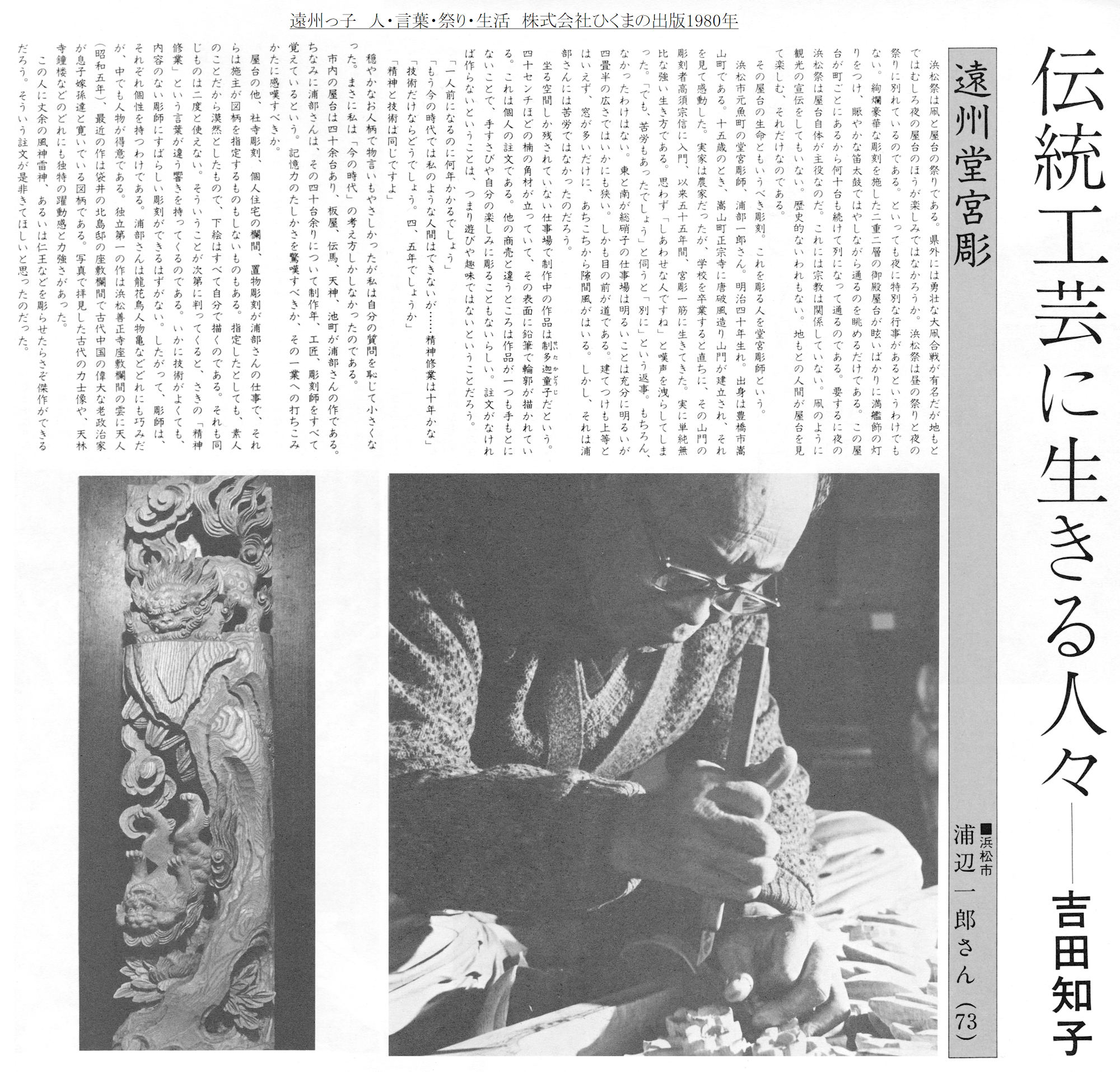 父・利三郎の次男として掛川の仁藤町で生まれる(1933)。中学生の頃から彫刻を覚え始め、卒業して父の元で本格的な修行に入った。特に戦後は浜松が屋台建造繁忙期をむかえ、伝統ある尾張彫長(ほりちょう)系彫刻の名門として多くの屋台や神社仏閣の彫刻を担ってきた。平成元年に浜松市幸町に移転、平成4年完成の浜松市まつり会館展示屋台にも腕を振るった。「いい時代に巡り会えて多くの仕事を任せてもらうことができた。彫刻は軽い(繊細な)彫りが理想」という。