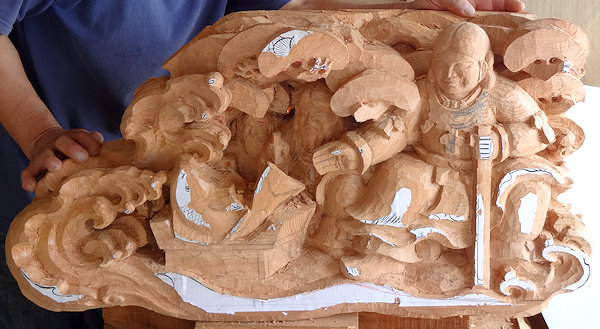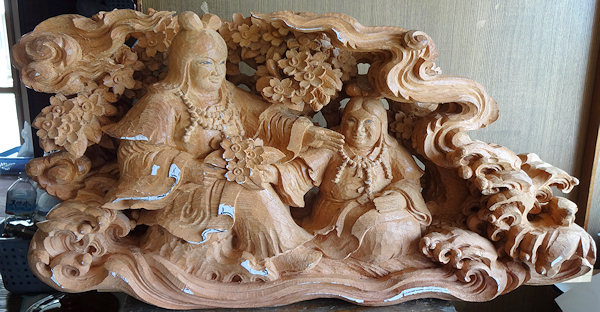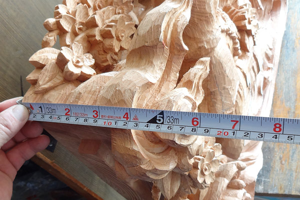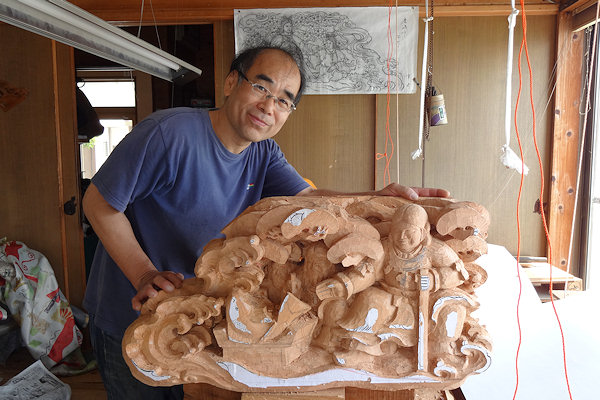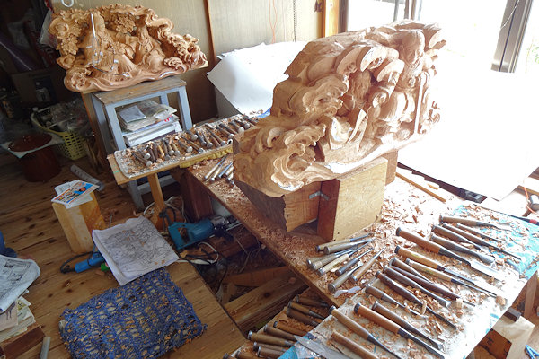 →2014/04/29_完成 2013/06/23(日) 伊藤章晴さん工房見学 「茨城県鹿嶋市の山車彫刻を任せていただくことになりました」とご連絡をいただき見学に馳せ参じました。山車彫刻新調をご検討されていた鹿嶋市桜町さんが、当HPで磐田市豊岡敷地のHSさんご提供により公開させていただいた屋台彫刻写真(当時はフォト蔵使用)をご覧になり制作依頼されたそうです! 鹿嶋の山車ってどんなのかというと、依頼を受けている桜町区の山車ではないのですが参考までにと伊藤さんが資料を見せてくださいました。↓写真で赤丸のところに付く蕨手(わらびて)と呼ばれる部位になるようです。 向かって左側の蕨手彫刻~木花咲耶姫(このはなさくやひめ) |