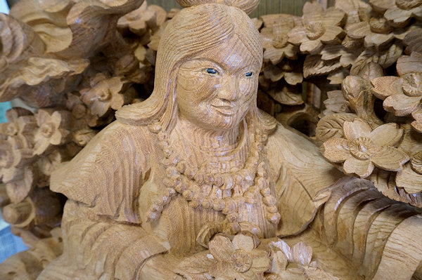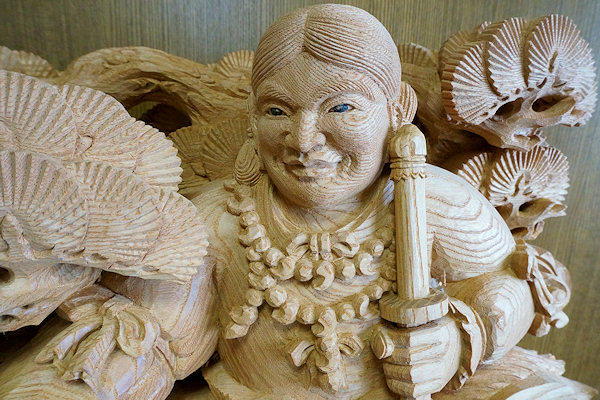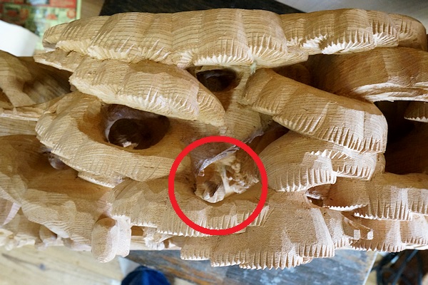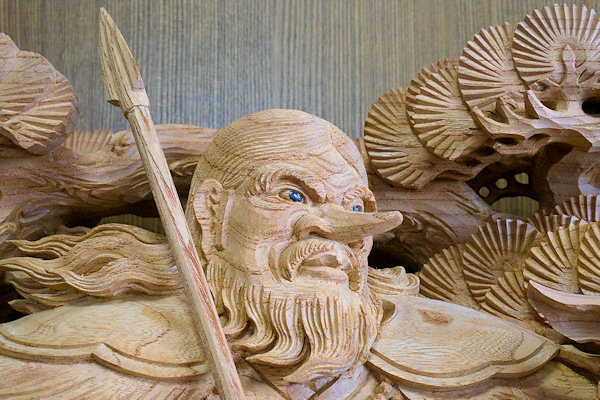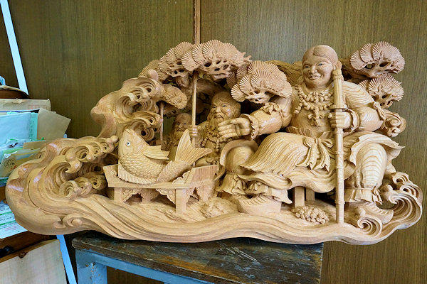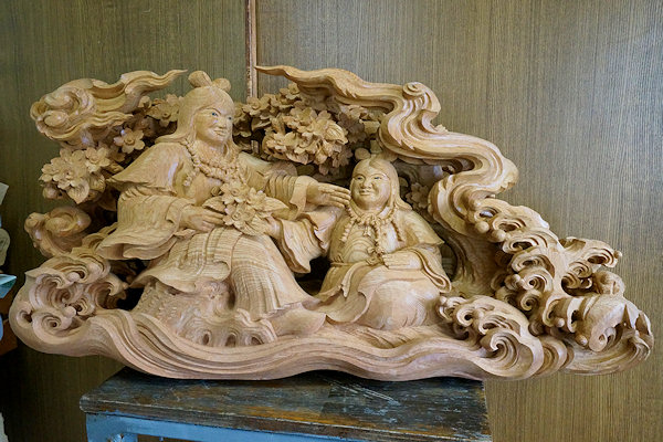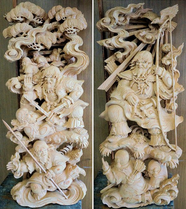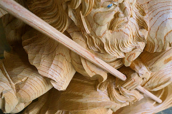 2014/04/29(火) 伊藤章晴さんの工房見学 2013/06/23日曜日訪問時に手掛けられていた茨城県鹿嶋市の山車彫刻が完成しました。図案は蕨手のみ施主さん依頼、他は伊藤さん提案とのこと。 蕨手(一対)欅5寸5分瓊瓊杵尊 木花咲耶姫 厚さ5寸5分の欅材から奥行きのある作品が彫り出されています。従者が手に持っている矛(ほこ)は一体ではありません。木取りの余材を用いて作成されました。↓彫刻を上から見ると○のところが矛の頂点になります。荒彫りの段階でここから長~いドリルで穴を開けて従者が手に持てるようにしています。矛などの細いモノは通常は周囲の背景などにくっつける構図で強度を確保するのですが、それだとスッキリみえないこともあるようです。