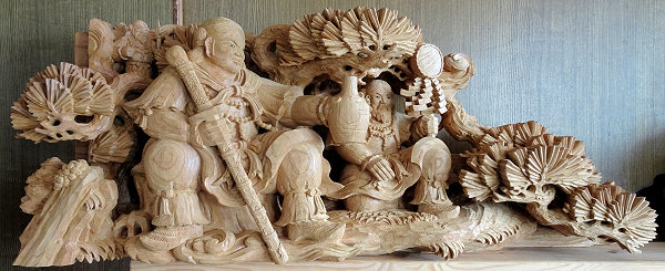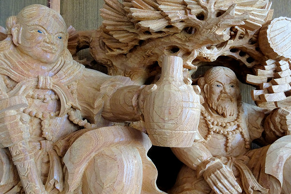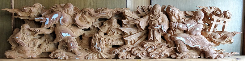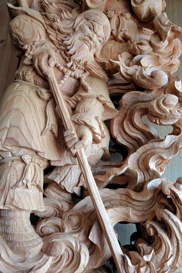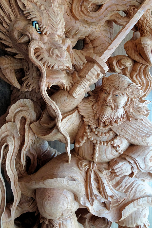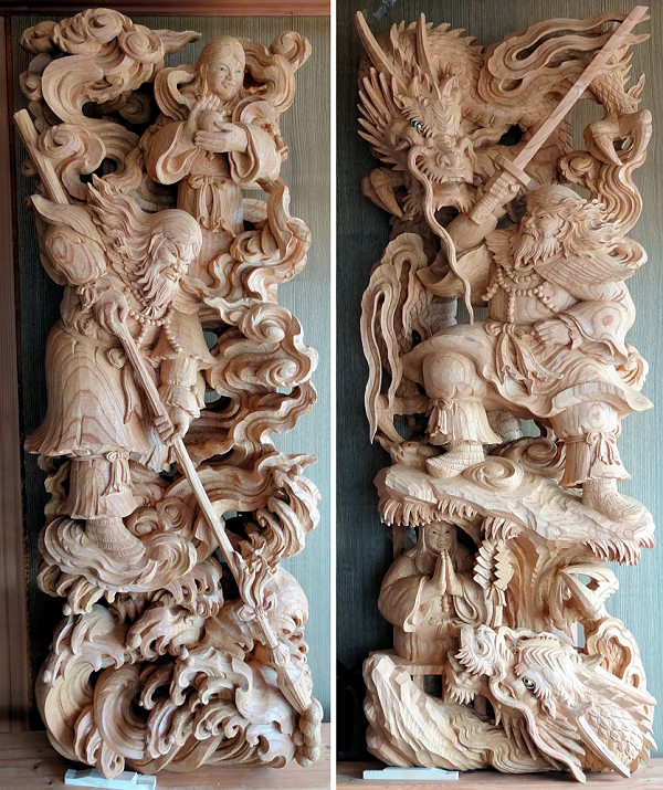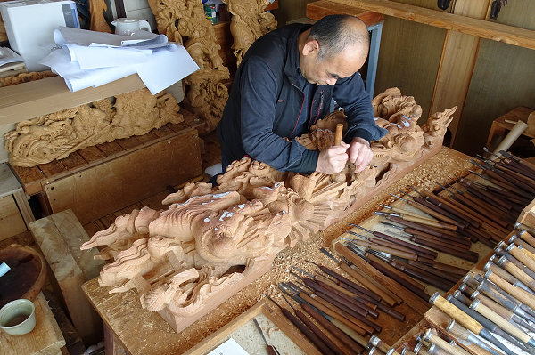 蕨手(一対)欅5寸天孫降臨 5点のうち最後の欄間彫刻の荒彫り中です。厚さ6寸5分の欅材は伊藤さんが今まで手掛けた中で最大となり、休みなしで計算すると荒彫り2ヶ月+仕上げ1ヶ月ほどかかるという大作です。「施主町内会さんのなかにご熱心な材木屋さんがおられ大工さんと協力されて良い材料を手配してくれました。いま手掛けている5点は全て同じ原木からとっています。時間はかかっても納得のいく作品にしてほしいとのご要望から、とてもやりがいのある仕事として手間暇惜しまず取り組んでいます」 方立(ほうだて) ※本来は蕨手の付く高欄を、高欄全体を彫刻にして蕨手と呼んでいるという解釈でいいらしいです。「この地域は明治・大正・昭和初期にかけての優れた山車彫刻があり、関心が高くご熱心な方々も多い。期待に応えられるよう全力を尽くします。これら5点に続き正面腰彫りと額縁も準備中。それと山車側面は神話等とは別の図柄で調整中です」と意欲を見せられる伊藤さんです。 |