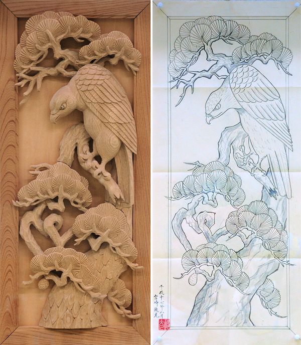 松に鶴~同じ下絵と材料で彫るわけですが出来上がりは皆面白いように違うんです(笑)。特に立体感に差が出ますよ