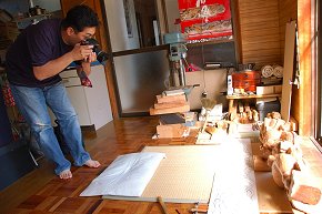 宮崎 「うーん、是非やってみたいですね。ええと、鬼板・懸魚2組でしょ、太平鰭2枚、欄間6枚、木鼻6つとして、あと脇障子は後ろの2枚ですね。どうかなぁ、今の技量だと3年ぐらいは欲しいですね。2年じゃキツイかな。時間もらえればしっかり彫れる自身はあります」