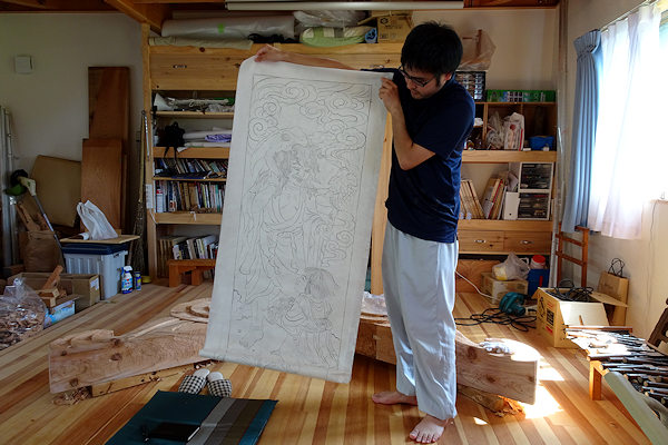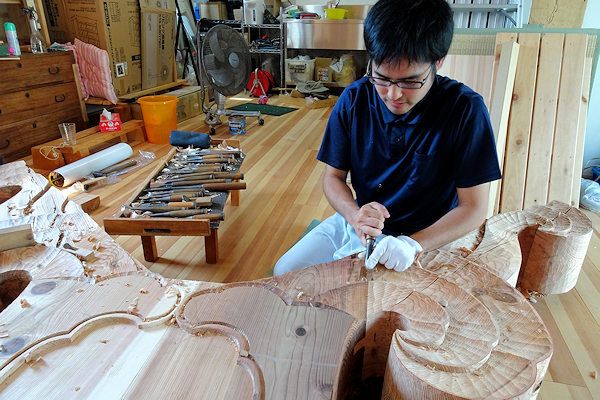 「独立してやっていくからには下絵からすべて自分で考えないといけません。澤親方のところは社寺なので主に龍・獅子・天女・鳳凰などを多く経験させていただきましたが、祭り屋台となると多様で未経験のものばかりです。彦尾・鶴亀連さんのおしゃもっさまのように嫁さんに下絵を考えてもらう場合もあります」