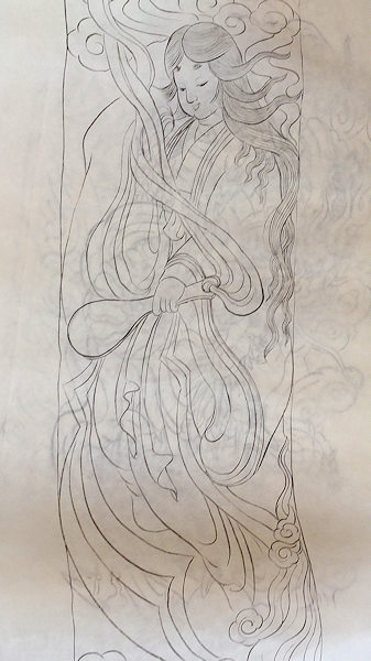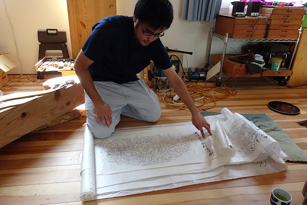 「組のご希望で前後の鬼板・懸魚は先代屋台の意匠を受け継いでいます。他のところは組の方々と話し合い図柄を詰めていきました。まず簡単な縮小版でラフスケッチを描き次に原寸大に起こしていくのですが、下絵用の紙は五箇山(ごかやま)和紙というものを使います。この紙が特別なもので、井波の澤親方から分けていただいています。これに墨書きすると滲まないんですね。こうすることで施主さんに説得力のあるご説明ができると思います」