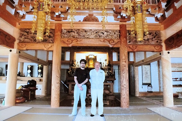 「初仕事として下絵から考え誠心誠意取り組ませていただきました。高い位置に取り付けられますから下から見上げて映えるようイメージしながら彫りました。こういうところは下絵に盛り込めないので難しいところです。完成取り付け後、ご住職と一緒の記念写真です」