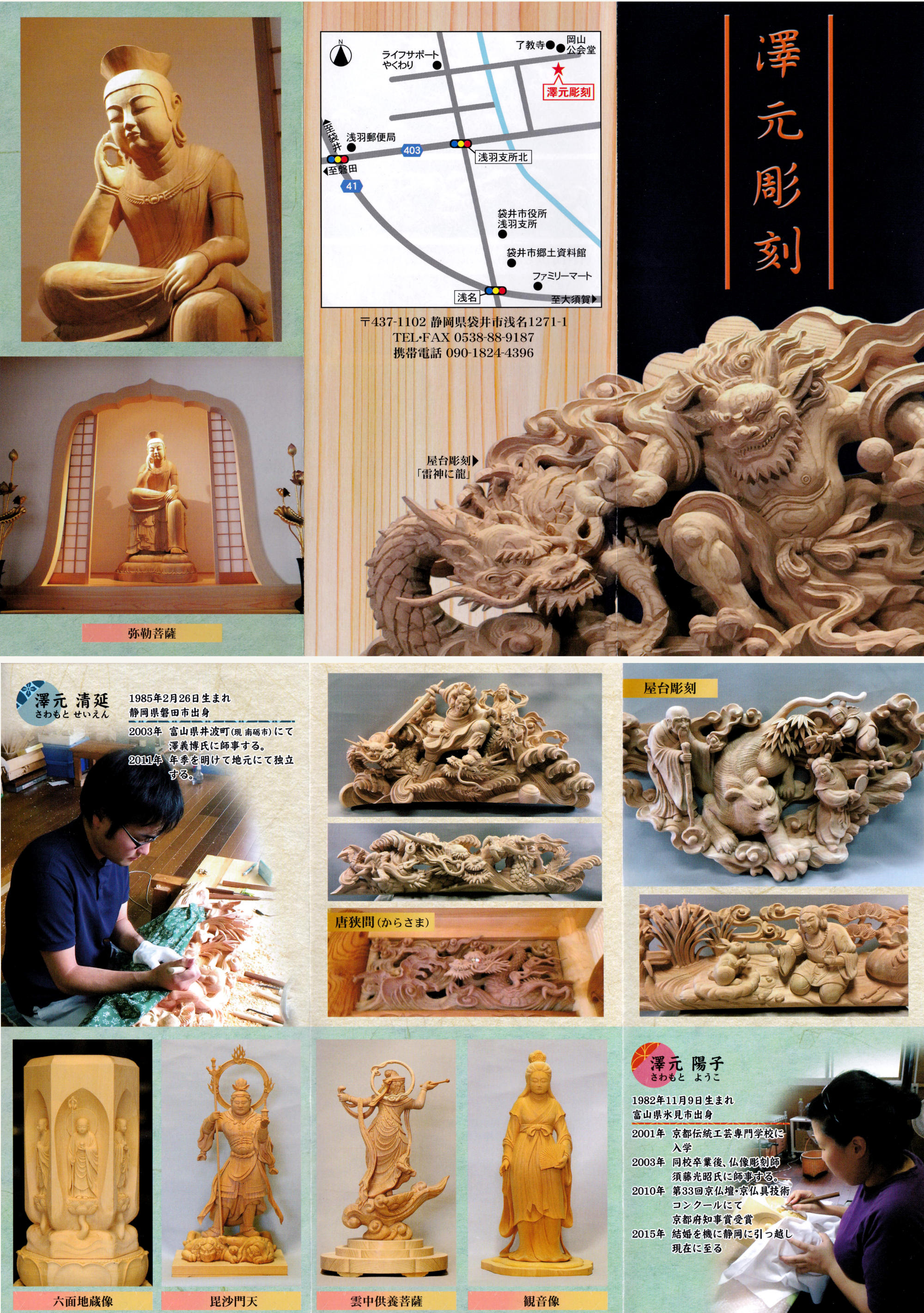 おかげさまで祭り屋台は平成28年(2016)磐田市中泉栄町さん、同時進行だった同市富丘さん(リーフレット表紙)、それと平成30年(2018)彦尾地区鶴亀連さんで3台になります。とてもありがたい号をいただいたので励みとし社寺や屋台の彫刻に精進していきたいです」