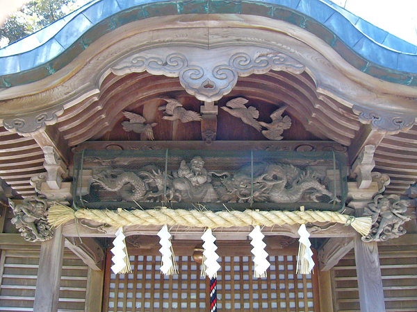 また昭和53年頃静岡県の修善寺温泉で痛めた腰のために湯治中、遠州森町南町の大工・故寺田勝郎氏と知り合ったことが縁で屋台彫刻の仕事を受けるようになったため、森町をはじめ袋井市、掛川市などにも作品があり親しまれています。 お話をうかがった後、近くの三国神社を案内していただきました。境内にある八幡神社の彫刻を若い頃に手がけられたそうです。木鼻が風神・雷神の珍しい構図です。いろいろと貴重なお話を聞かせていただき、誠にありがとうございました。
