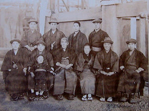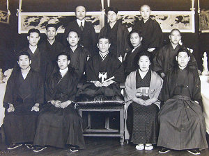 上の写真で、左は大正時代に善光寺の工事にて。後列向かって一番右が桑次郎さん。右の写真は昭和11年の彫常還暦祝いのときのもので、正面に座っているのが師匠の新美常次郎さん。前列向かって一番右が桑次郎さん。前列の一番左が二番弟子の岩田新之助(冬根とね)さん、その隣が後の2代目彫常・新美茂登司さんです。 次は志村孝さんご本人のお話です。 みせていただいたアルバムに彫り上がった破風の巻龍があります。これは唐破風と龍が一本の木から彫り出されている大変に手間のかかったやり方で、昭和34年完成の浜松市中澤町の屋台に付く志村さんの力作です。