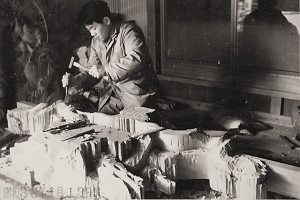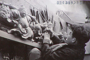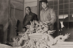 志村さん親子が一台全てを手がけた屋台もあります。昭和38年完成の浜松市野口町の屋台です。下の4つの写真が同彫刻に関するもので、同年に西伊場の大工・奥田さんの作業場にて写されたものです。