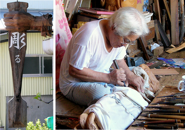 右:石田組屋台彫刻を制作中の峨聖さん