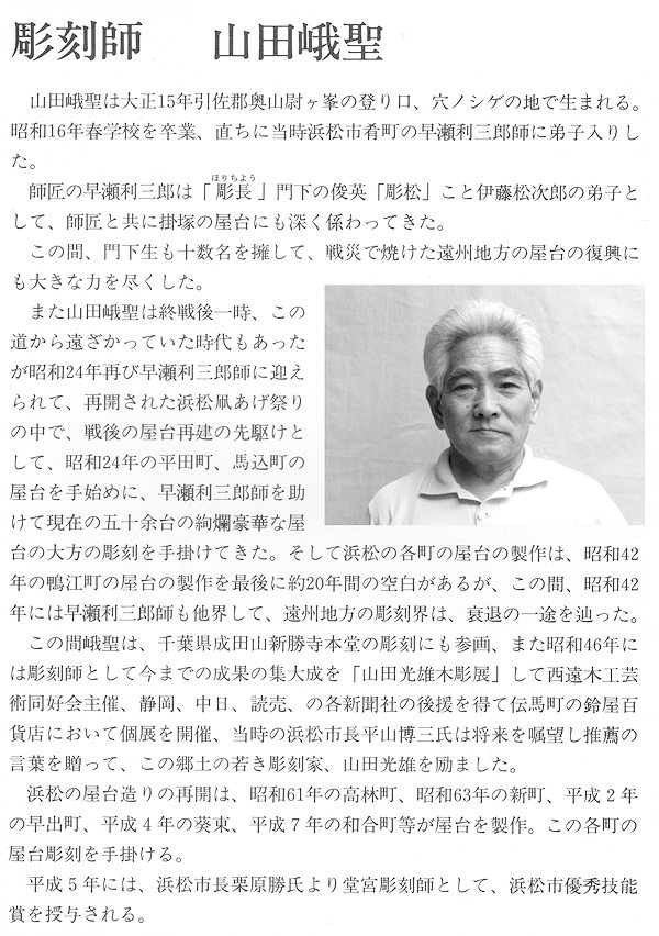 現在制作中の磐田郡福田町中島地区「石田組」新屋台の彫刻は、以前山田さんが彫られた旧屋台の欄間と木鼻彫刻を継承することから、新たに鬼板・懸魚と脇障子の彫りを依頼されました。