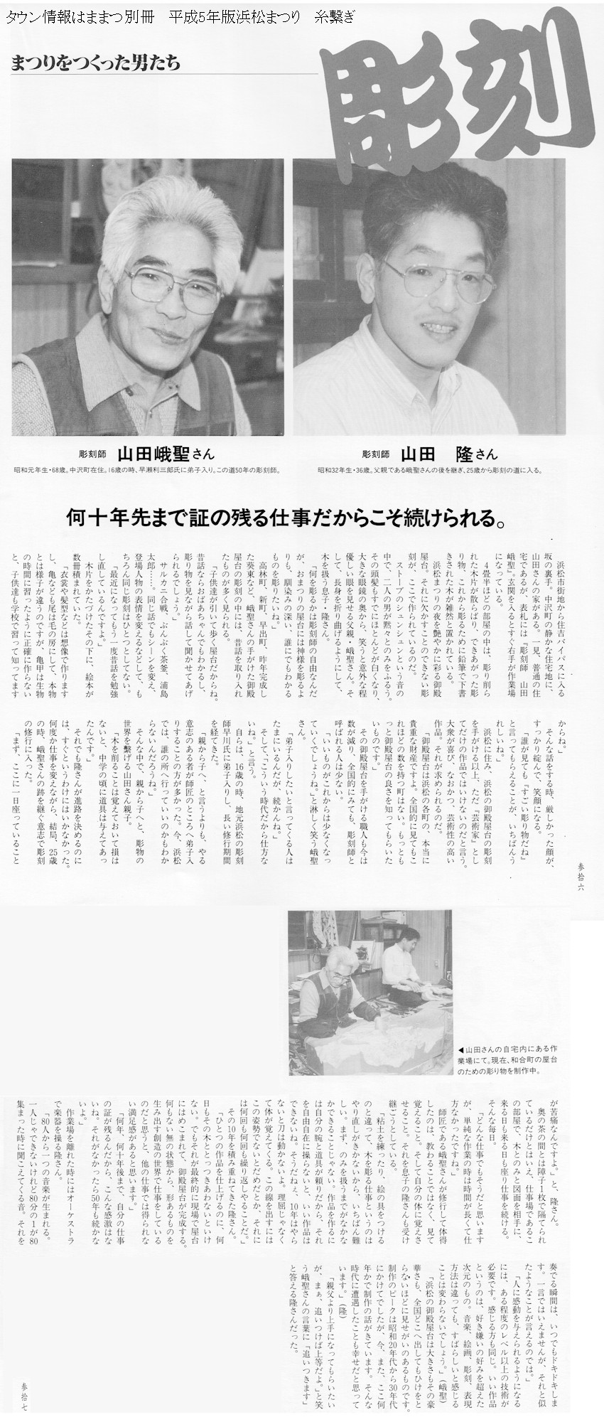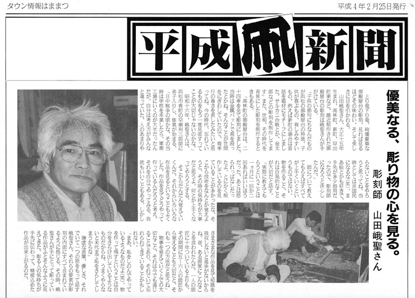 「手長・足長は高山の屋台や半田の山車、掛塚なんかにもある。石田組のは表裏両面を彫ってあるから屋台の後姿が面白くなるんじゃないかな」堂宮彫り一筋60年余、円熟の技が冴える山田さんです。