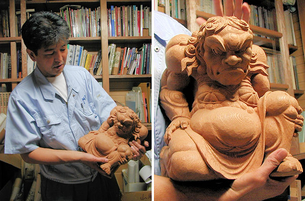 平成10年に完成した磐田「玉匣社」山車の見事な彫刻で一気に注目を集めるようになりました。彫刻の作業場は別だそうで「僕は彫らないんです。施主さんと納得いくまで話を詰めて図柄や構図を考え、彫刻専門の職人に指示して彫ってもらいます。いわゆる看板を上げてやっている人ではないんです。彫り方は細かく指示しますよ。目に付きにくいところ、例えば龍の鱗一枚の形状までこだわったりしますね。玉匣社さんは2年の期間をいただけましたので、あれだけのものが出来たんです。」
