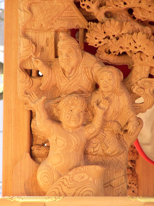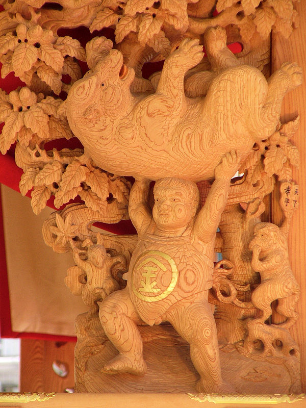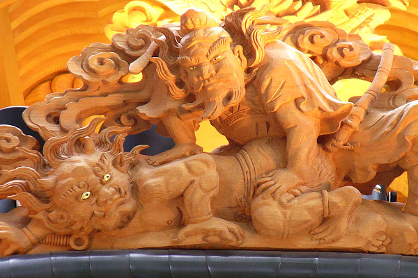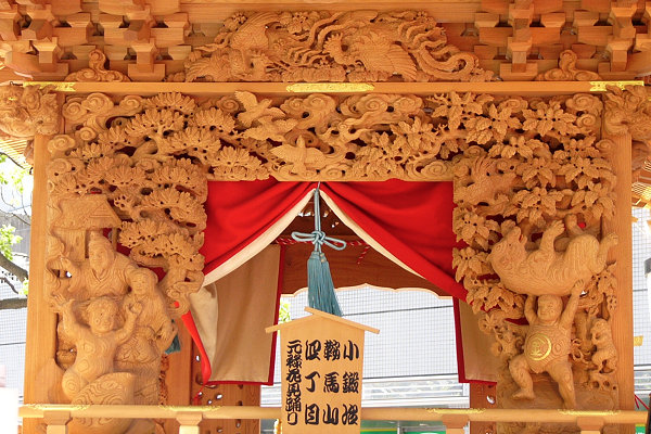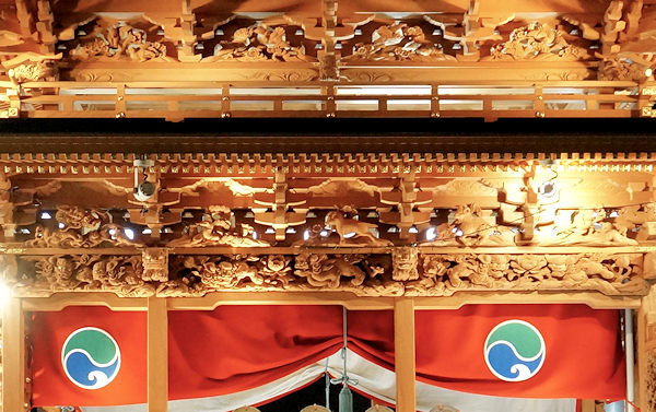 小池流屋台で唐破風と入母屋の軒との関係を指す小池流固有の名称ということです。一層大唐破風屋台の唐破風の形をそのまま入母屋に組み込んだと解釈できる造りで、裏甲より突出する破風板による凹凸で入母屋の軒に絡んでいることを指します。軒搦の名称は遅くとも昭和末期には用いられていたことが小池さん側の資料から確認されており、屋台の造りとしては昭和25年「鍛冶町」さんから現在に至るまで小池製唐破風入母屋造りの屋台は一貫して軒搦となっています。大工さんによる意匠の違いを見分けるのも屋台見物の楽しみかもしれません。