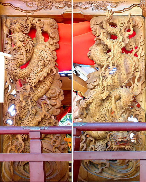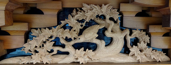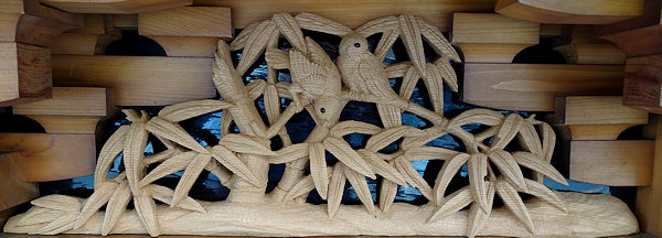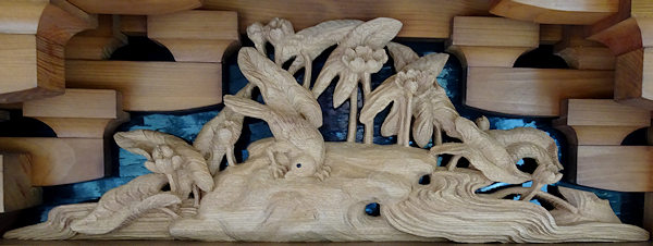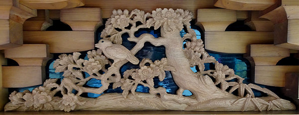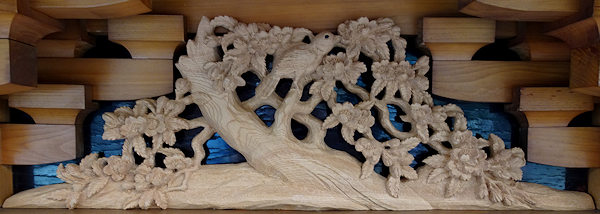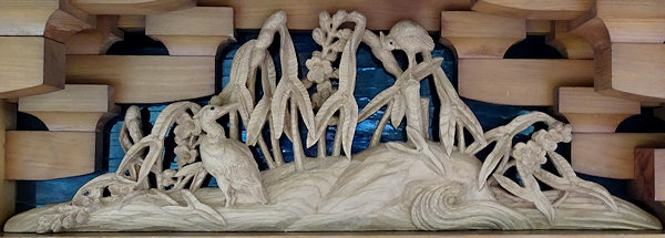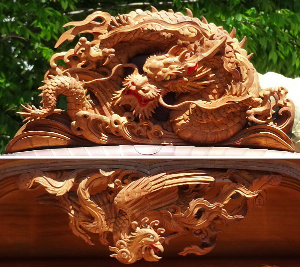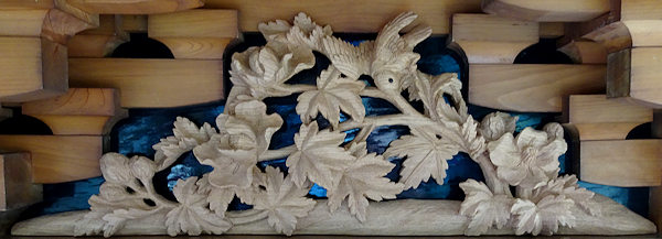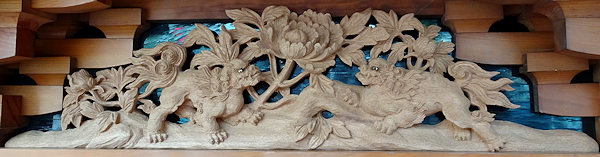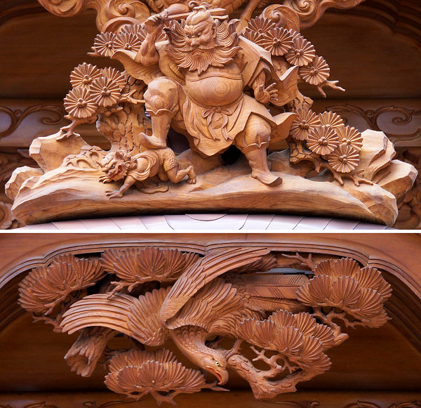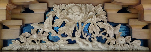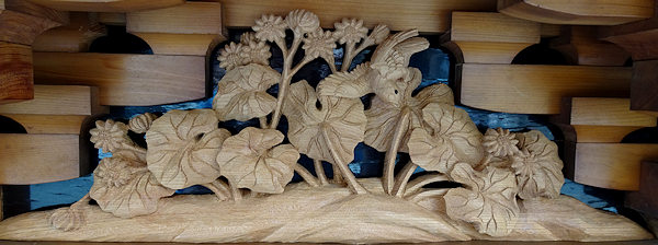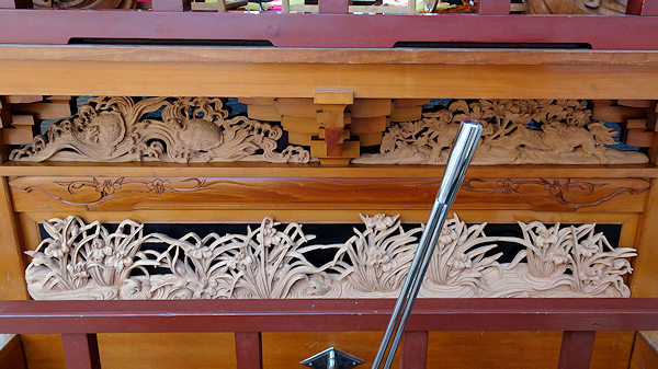 正面腰板~流水に菖蒲 右側面腰彫り~牡丹 左側面腰彫り~海棠(かいどう) |