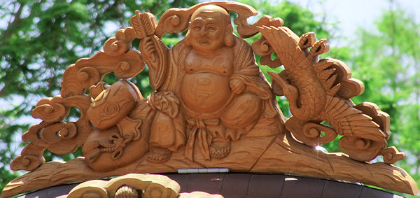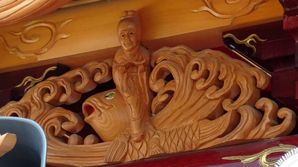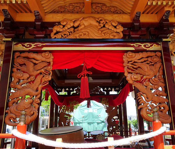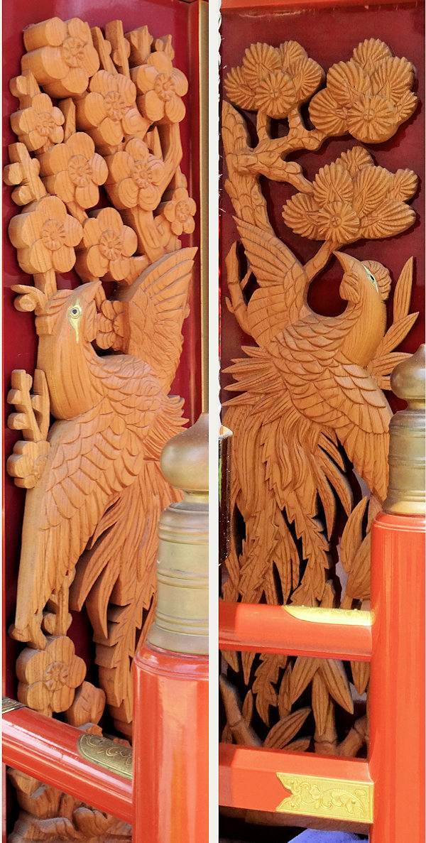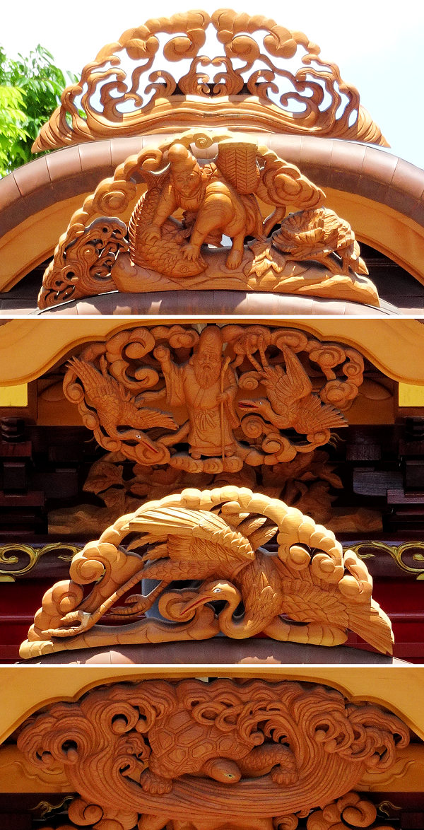 獅子に牡丹 龍虎 側面~十二支 瑞雲? 恵比寿 福禄寿 鶴亀 波兎~謡曲 竹生島(ちくぶじま)「 竹生島も見えたりや 緑樹影沈んで 魚木に登る気色あり 月海上に浮かんでは 兎も波を奔るか 面白の島の景色や」