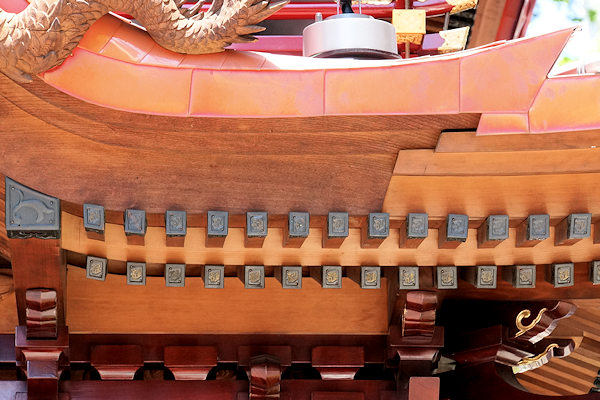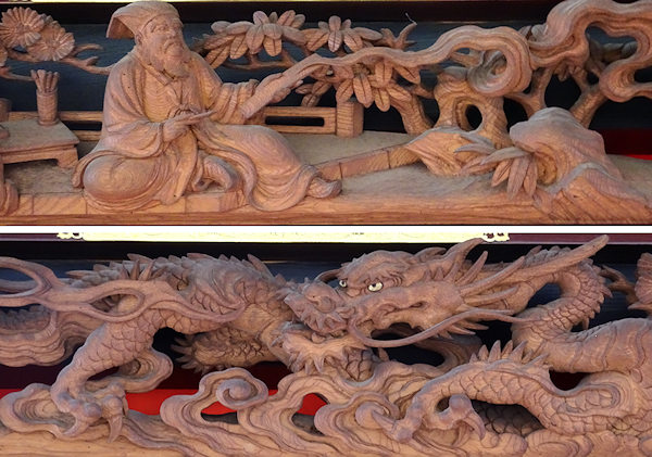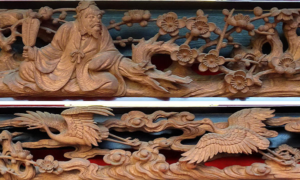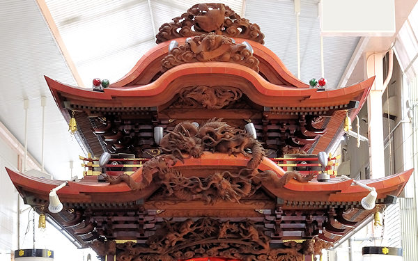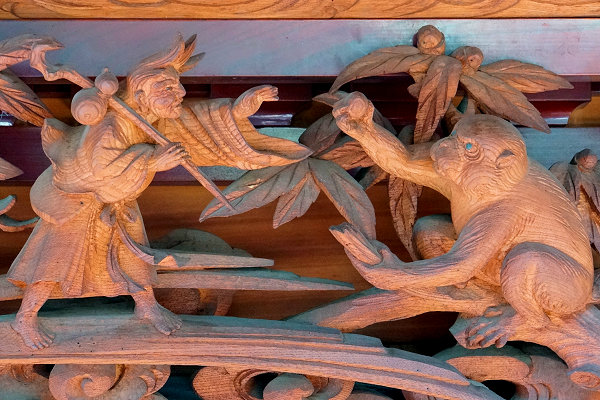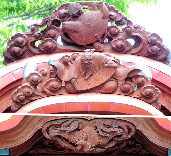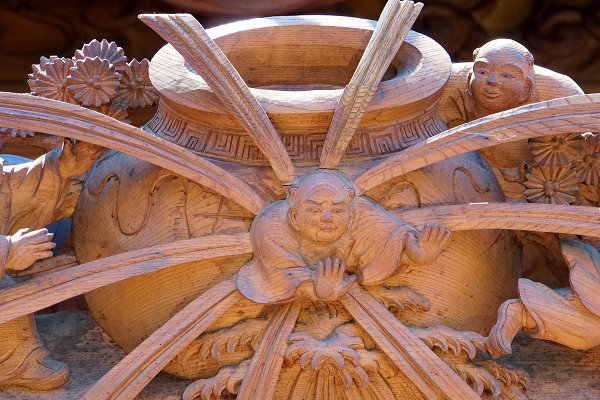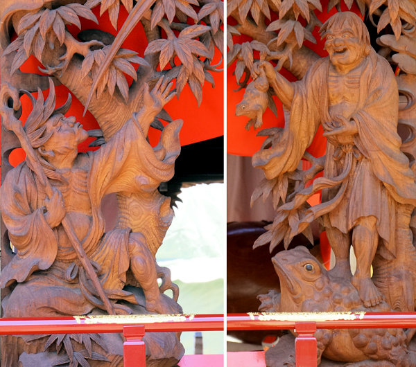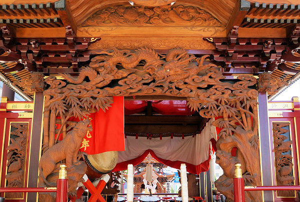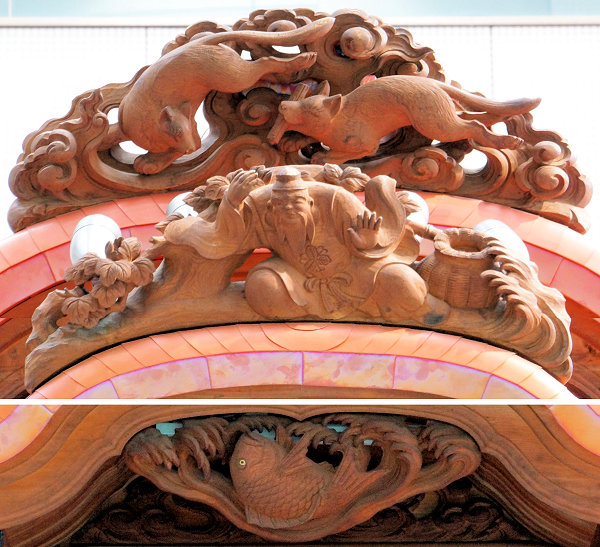 ぶたきつね、肅史(しょうし)仙人 唐破風に夫婦龍・結縁の力 蝦蟇仙人、鉄拐仙人 高欄の巻龍 右側面 林和靖(りんなせい) 左側面 龍を描き出す呉道子(ごどうし) 二匹の狐、大黒様・鯛 龍虎 粟鶉 |