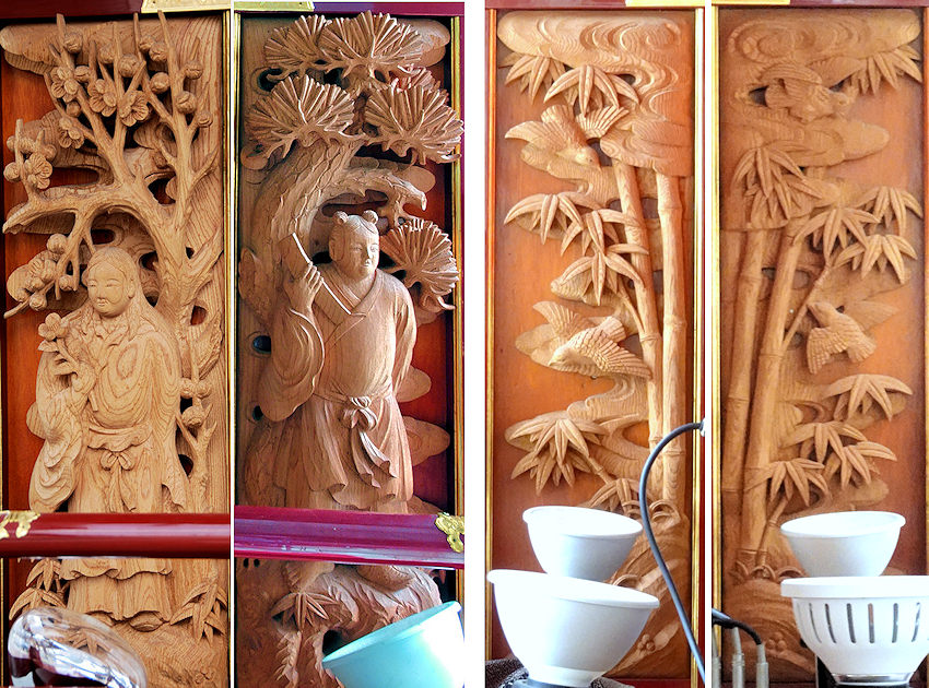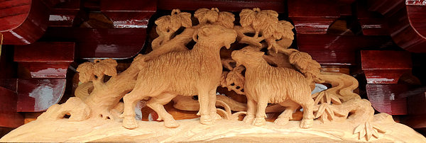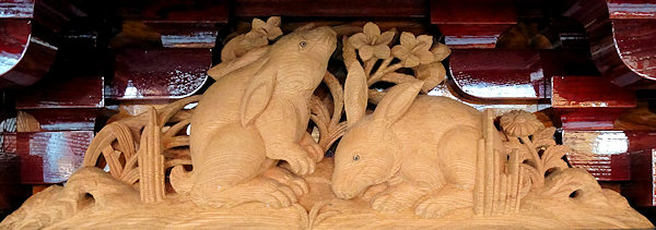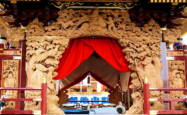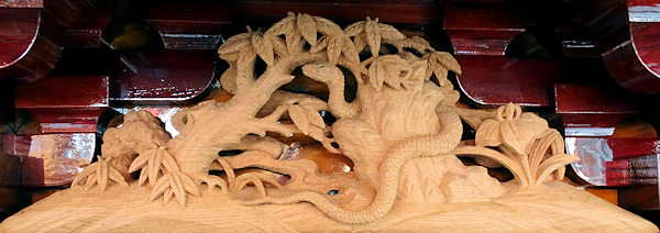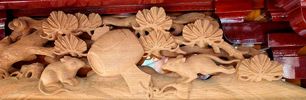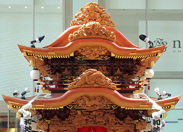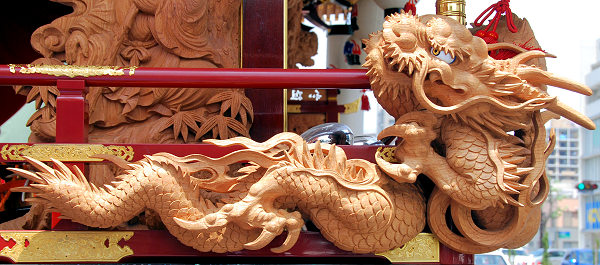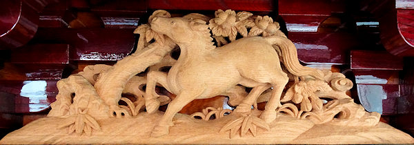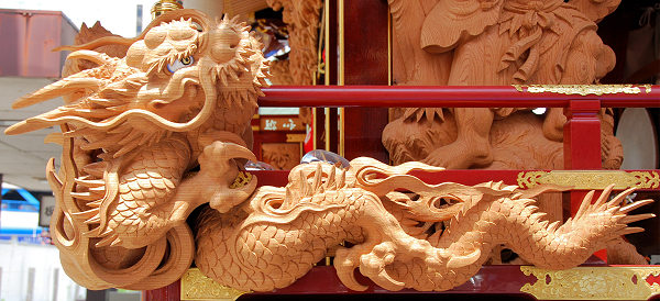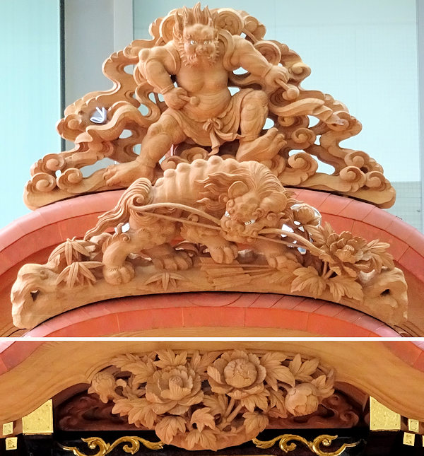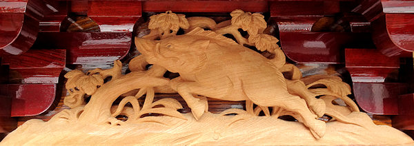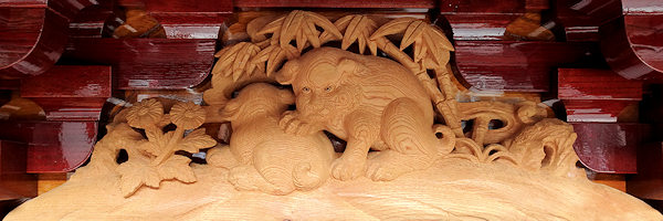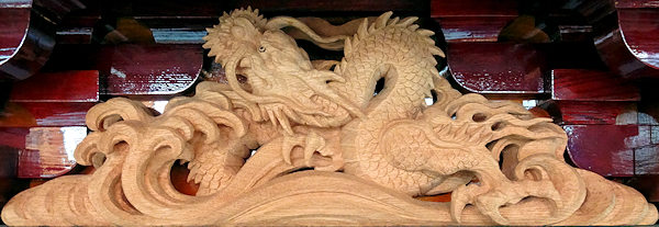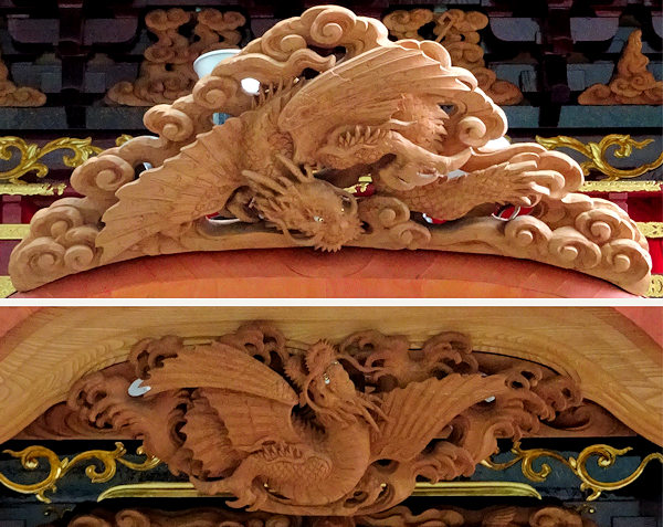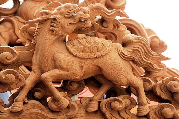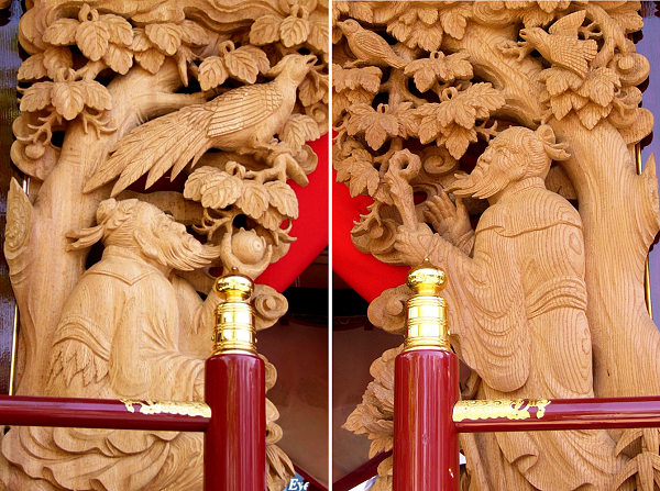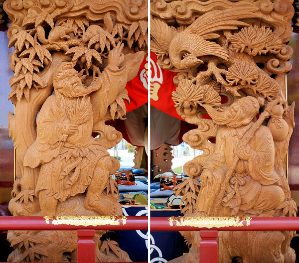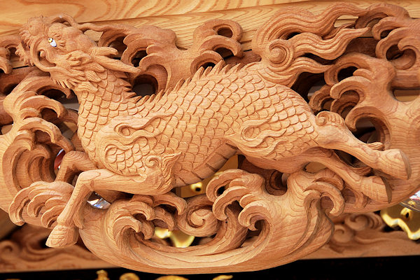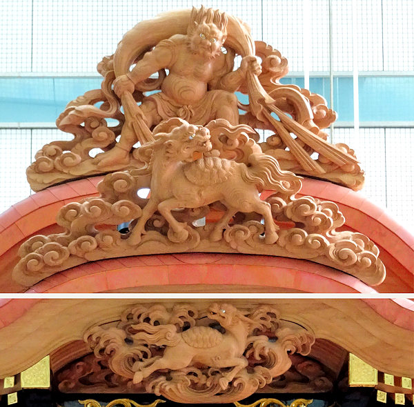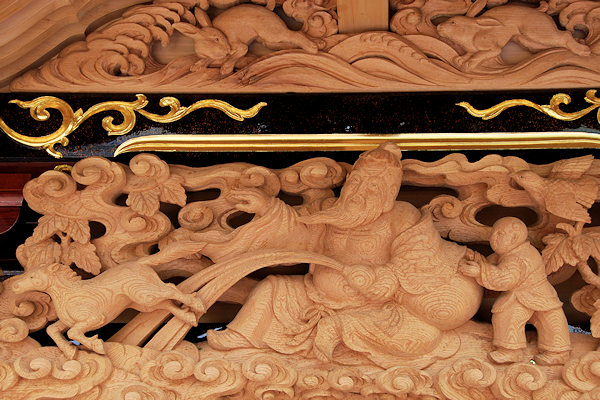 雷神 獅子 鳳凰 麒麟 木鼻 【八仙】中国の民間伝承の8人の仙人。鍾離権・張果・韓湘子・鉄拐てっかい・曹国舅・呂洞賓・藍采和の7人と女仙何仙姑。 呂洞賓 高欄の巻龍 土台の木鼻 右側面 風神 犀(さい) 飛竜(応龍)~水を司る霊獣