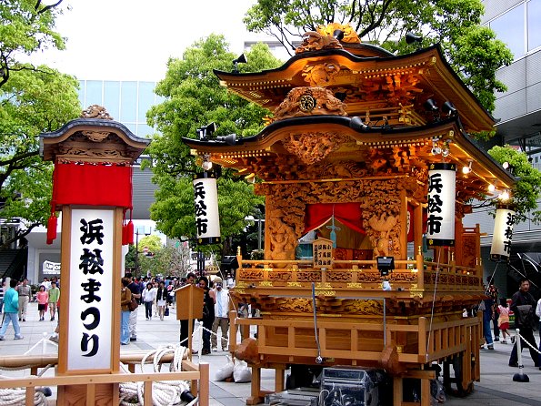 遠鉄百貨店北側の広場に展示されている浜松市の屋台。ステージが設けられていてイベントが行われていました。屋台の前で記念写真を撮る人も多く大盛況です。