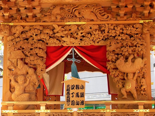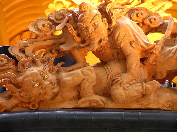 屋台で番をされている方からよく声もかけていただきました。「屋台を撮らせてください」というと皆さんとても気さくに「ゆっくり見てってよ。屋台が好きならこれあげるよ」とパンフレットや手拭いをもらったりもしました。福田のような唐破風一層型の屋台だと鬼板・懸魚彫刻が一番の見せ所になるのですが、浜松の屋台では欄間・虹梁・御簾脇が一体の図柄として構成されているものが多く、揚虹梁+御簾脇といった感じでメインになります。ここは前後とも日陰になるので撮影しやすいためしっかり撮ることができました。素晴らしい彫刻が数多く見られ時間の経つのも忘れてデジカメを操作しておりました。上は「天神町」、浦部さん傑作の1つです!