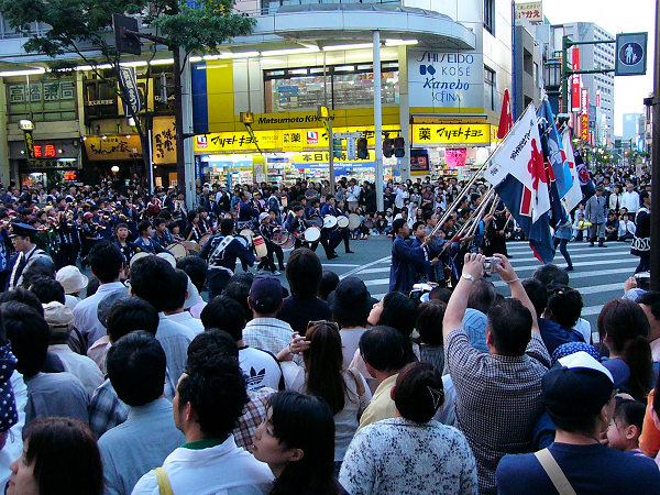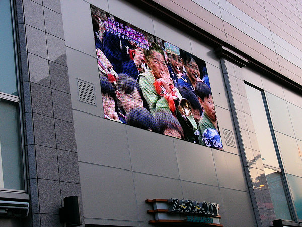 夜はZAZA CITYの前で合同練り・屋台引き回しを見物です。人出が多くてなかなか様子が見えず後ろのスクリーンを見ている人も多かった。