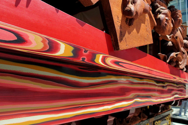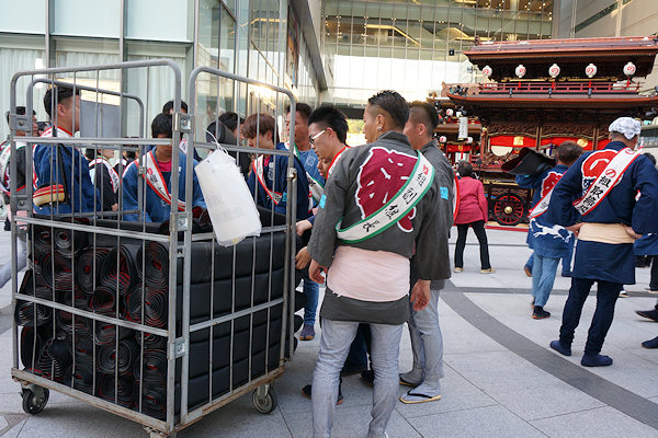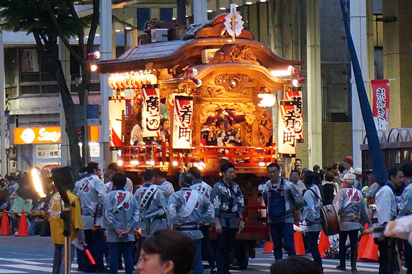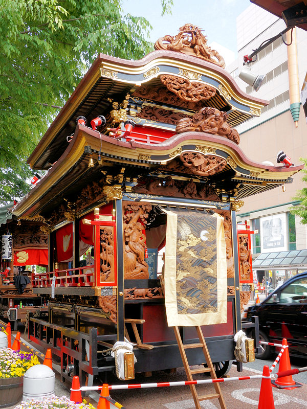 2015/05/04月曜日 2015/05/05火曜日 ソラモに移動、今日は4台展示されています 彫刻にばかり目が行きがちですが…とても高度な技法が要求される縁板・縁葛の堆朱(ついしゅ)も見事です 向宿町屋台の前で手をふる家康くん ソラモから屋台を搬出するのは初めてみました 伝馬町交差点北へ移動 おっと屋台に照明が入った、綺麗です! |