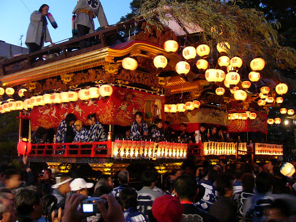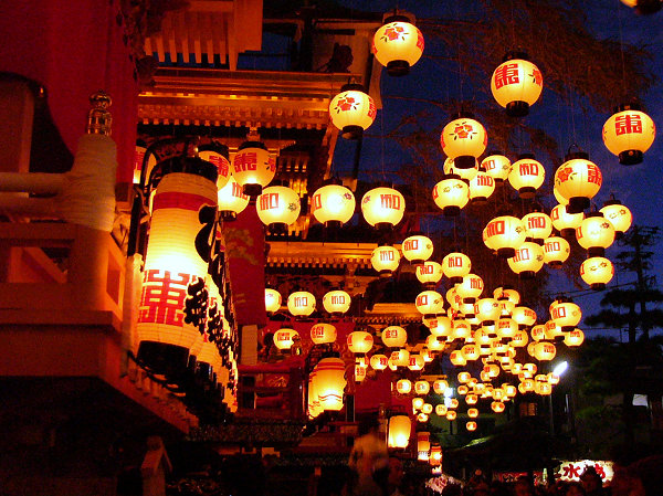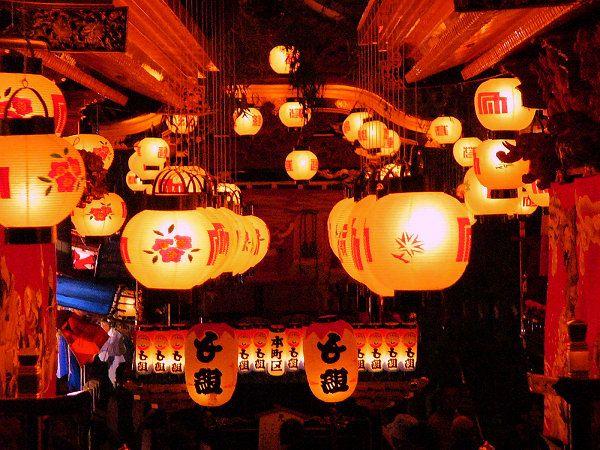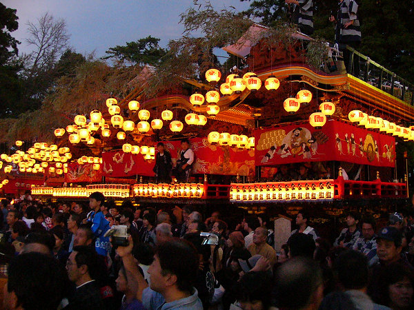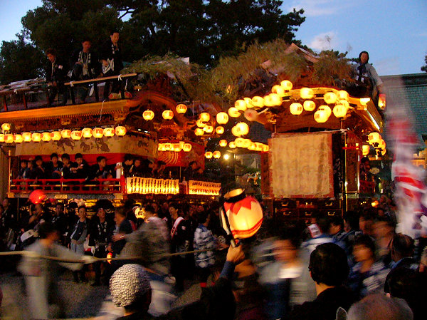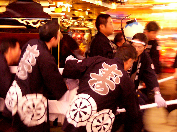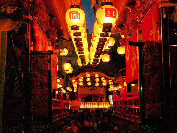 魚屋さんのところで9台全ての方向転換を見て最後の「本町」屋台にくっついて境内へ 所定の位置に屋台が揃います すっかに日が落ちて蝋燭の提灯が幻想的