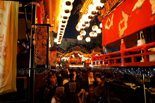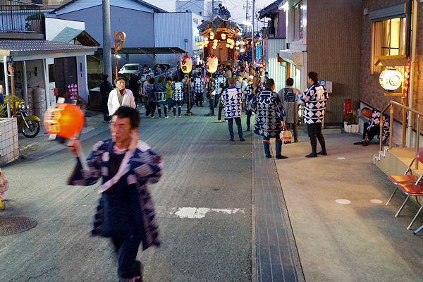 2012/10/21日曜日 磐田市掛塚(かけつか)祭り 今日は都合により夕方からの見物です これから国道150を渡ります…年番走る かつての夜景撮影は三脚立てて苦労して撮ったものですが今は手持ちでお気楽に撮れます |