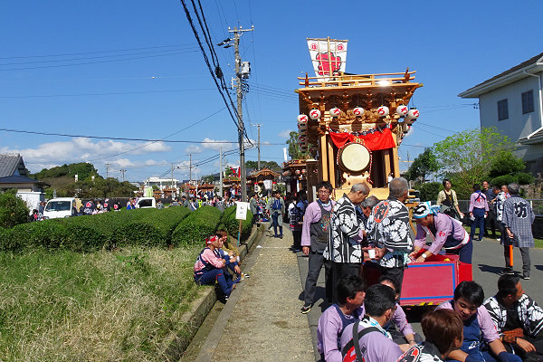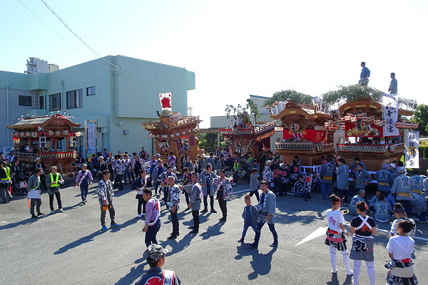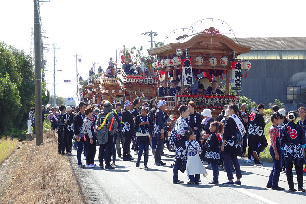 朝9時半、予定通り東新屋・造立神社西側の農協跡地に蛭池(左)と南島(右)の屋台が到着。