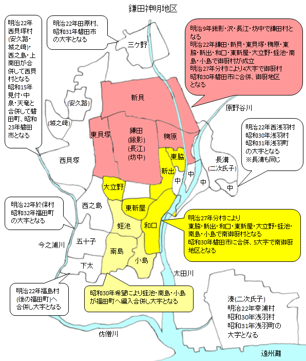 鎌田神明宮は、衣食住を始め産業の守り神である伊勢神宮外宮の豊受姫之神として古くから多くの近隣部落の信仰を集め、情勢による分村や編入合併後も鎌田神明宮との氏子関係は保たれ現在に至っています。