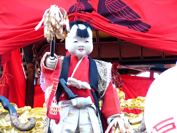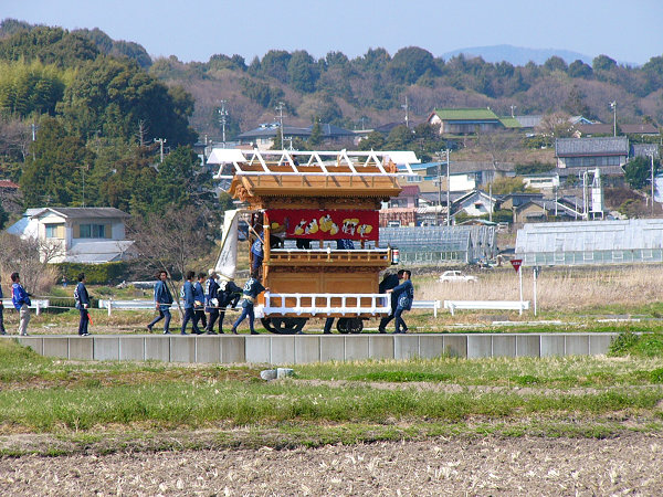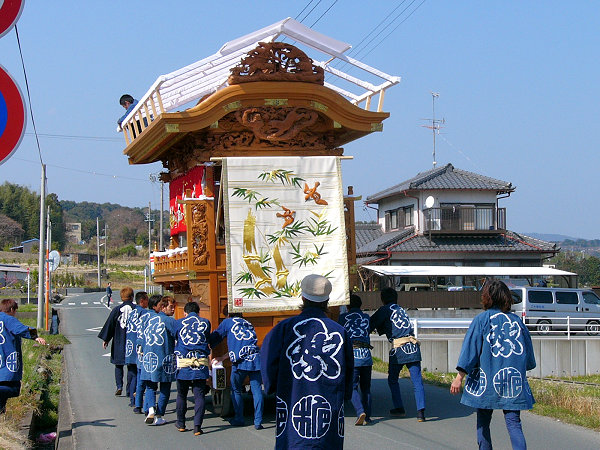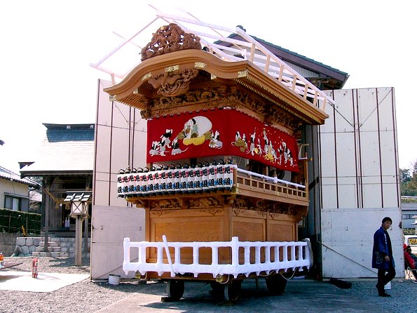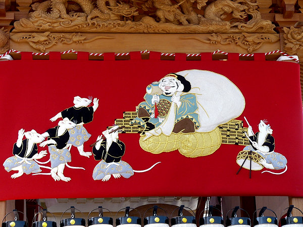 2004/03/28日曜日 梔組の天幕完成披露 「大黒様とねずみ三様図」 稼ぐねずみ、蓄えるねずみ、遊ぶねずみ 京美刺繍工芸(株) 《MEMO》 棟梁:小池 清(昭和56年) 屋台:5尺3寸 彫刻:浦部一郎(昭和60年) 見送り幕は2003年完成