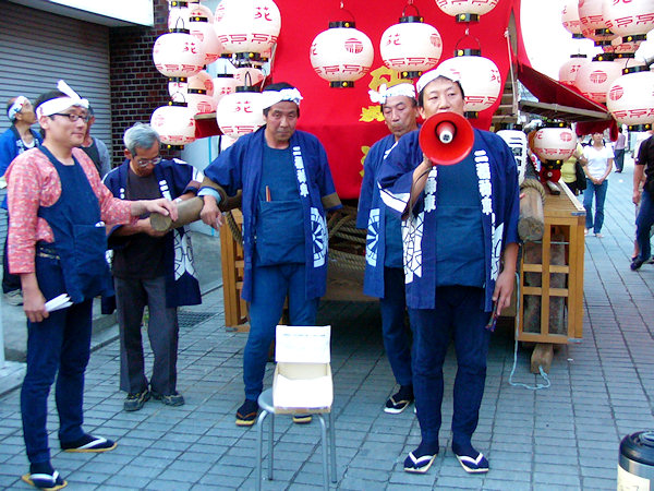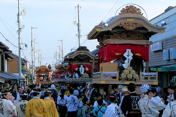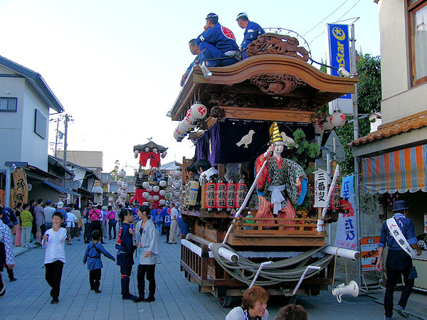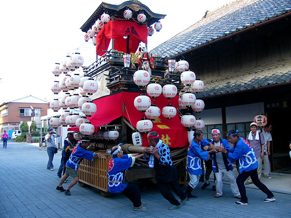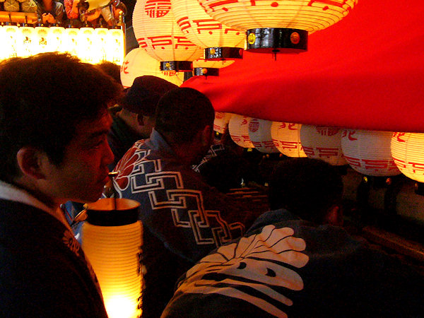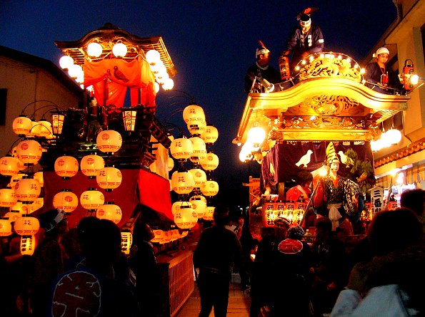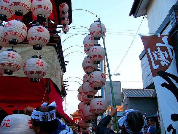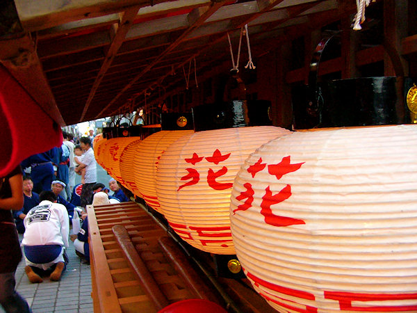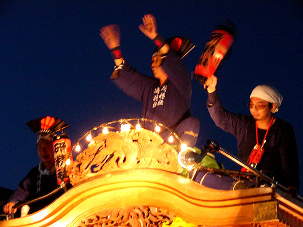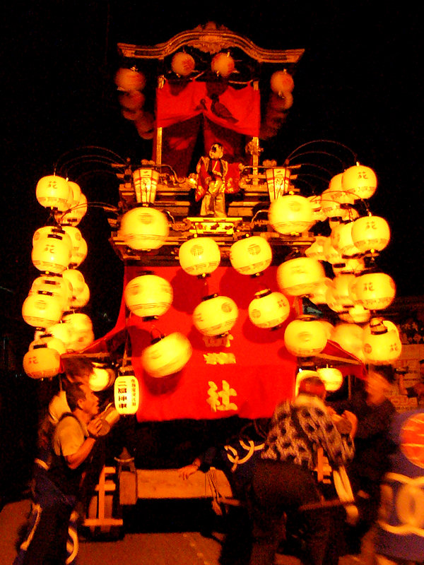 2004/09/11土曜日 麁玉地区 宮口六所神社祭典 17:30庚申寺前に勢揃いした屋台。これから六所神社へ向かいますが…今年は旧二福神車を中心に見学です 名古屋/二福神車の方々により飾り付けた山車を所定の位置へ移動 この山車本来の提灯と采振り人形が付けられています 名古屋二福神車の方々がご挨拶、持参の提灯に蝋燭が灯ります (^^) お囃子の「車切」これを聴くのは何年ぶりか…風情があっていいものです お囃子の様子を覗き込む「尚義団」の若衆 日が落ちて提灯の灯りが山車を柔らかく照らします