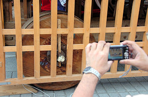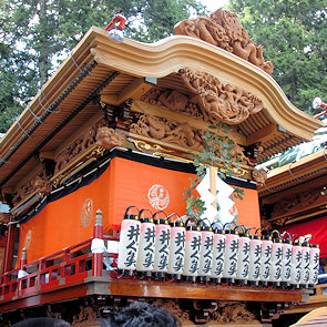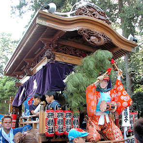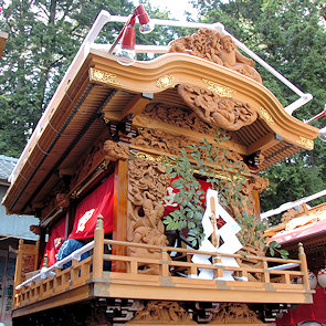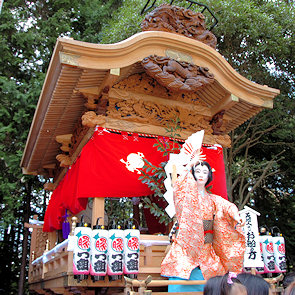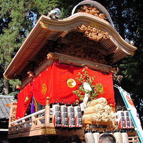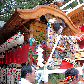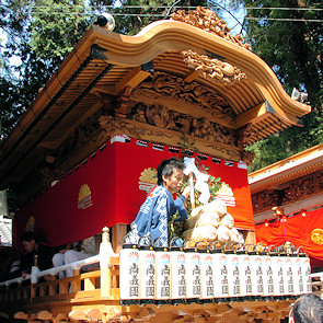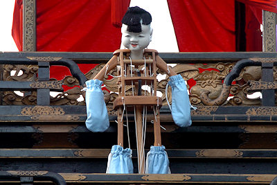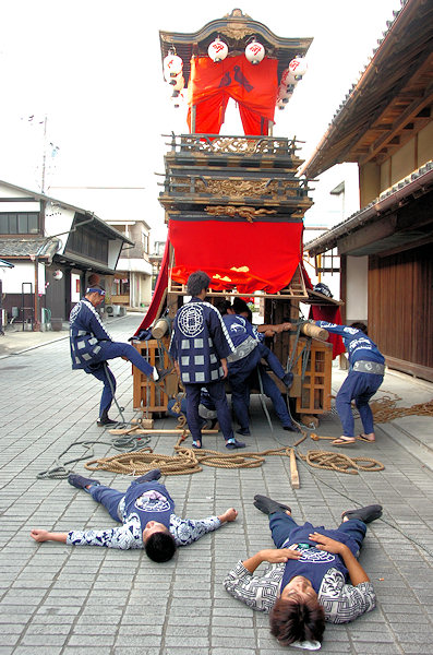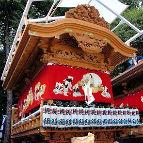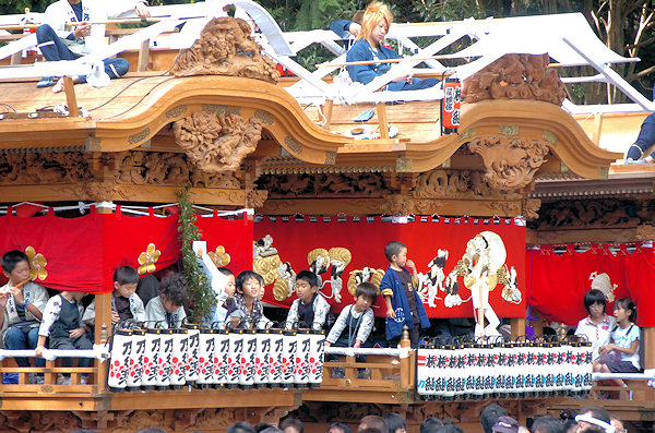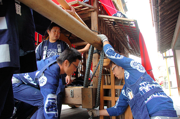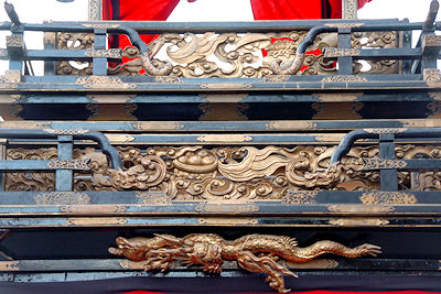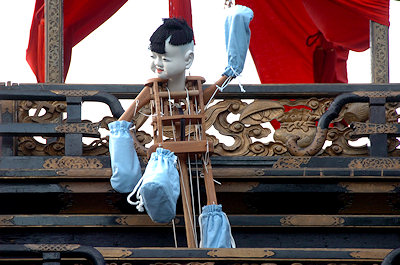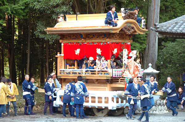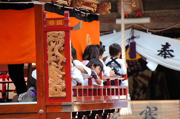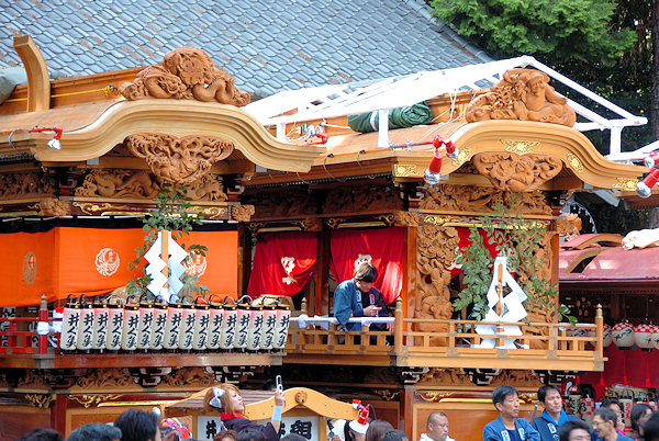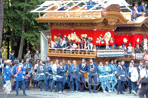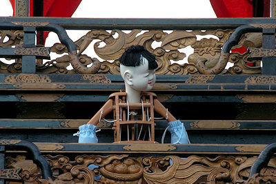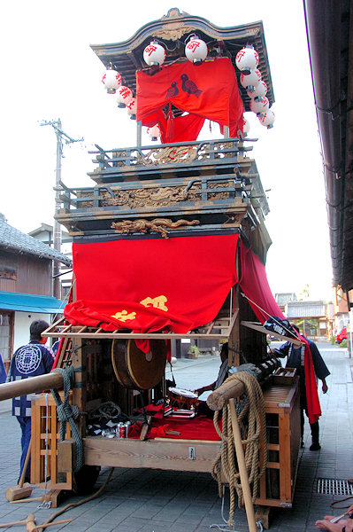 山車の正面をみていると… 狂言神楽という曲だそうで庚申寺前の雰囲気によく合います |