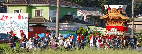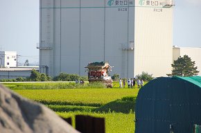 あそこに見えるのは昨年シートを被ったままだった雲組、ズームめいっぱい。そこに向って東組が左折していきます