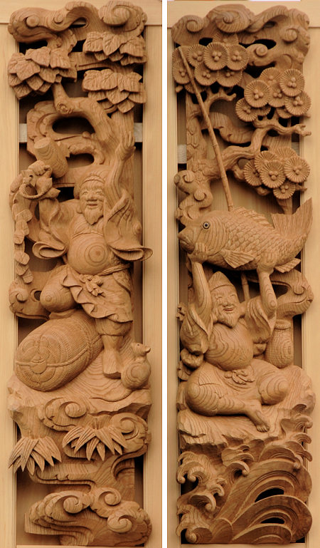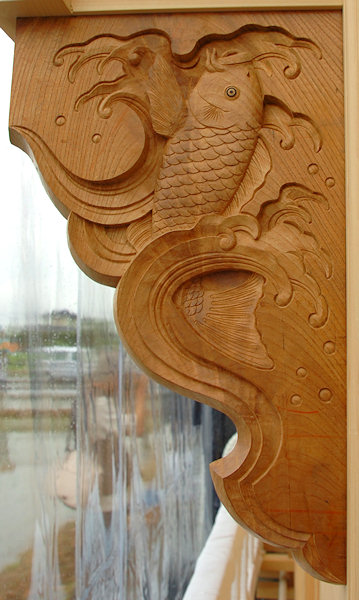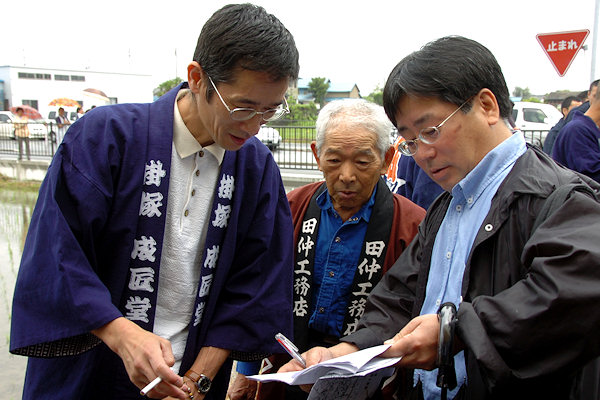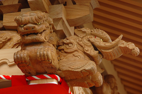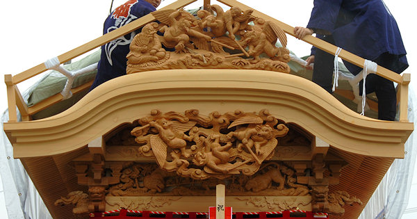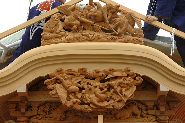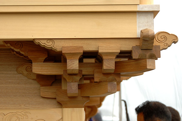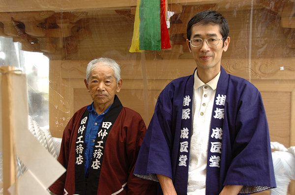 屋台は磐田市天竜の田仲工務店/田中棟梁(向かって左) 彫刻は掛塚砂町の成匠堂/前島さん(向かって右) 中日新聞の取材に応えられていました 鬼板/懸魚 木鼻 脇障子 持ち送り 雨がほぼ止みシートを外しての集合写真。正面柱間口5尺2寸の威風堂々たる立派な屋台です。天幕は浜松市の三原加工所さんとのこと。 ロープが張られ、いよいよ曳きまわしです (^^) 見学させていただきありがとうございました。