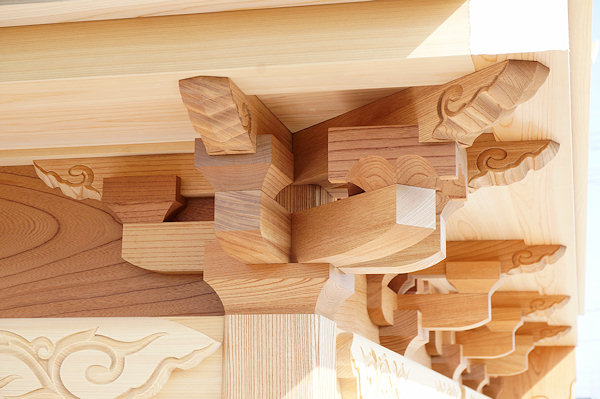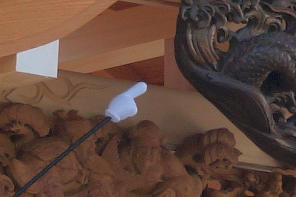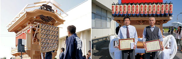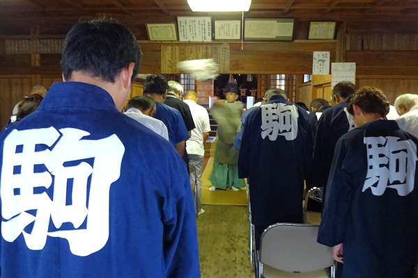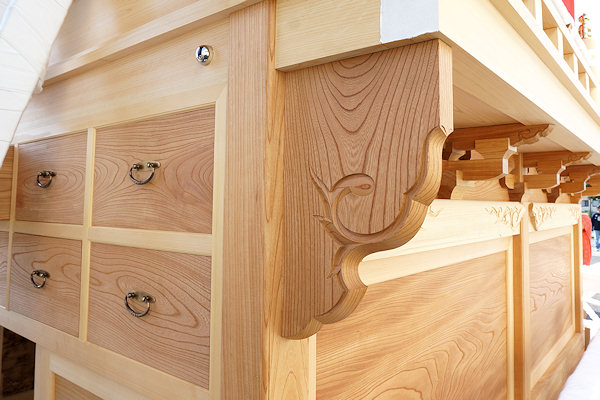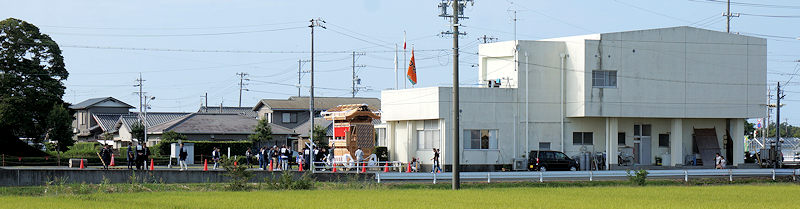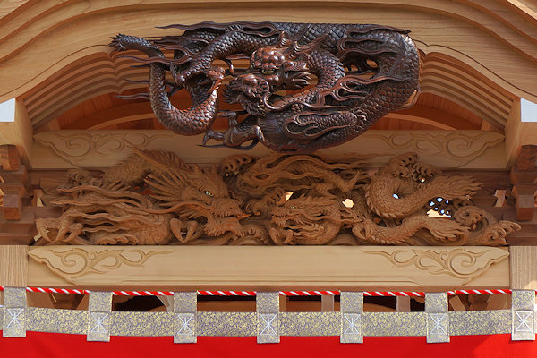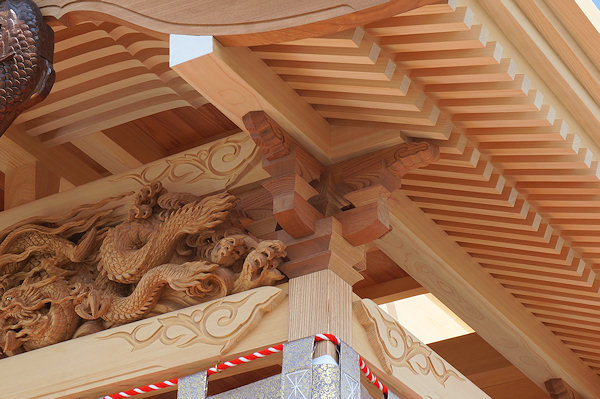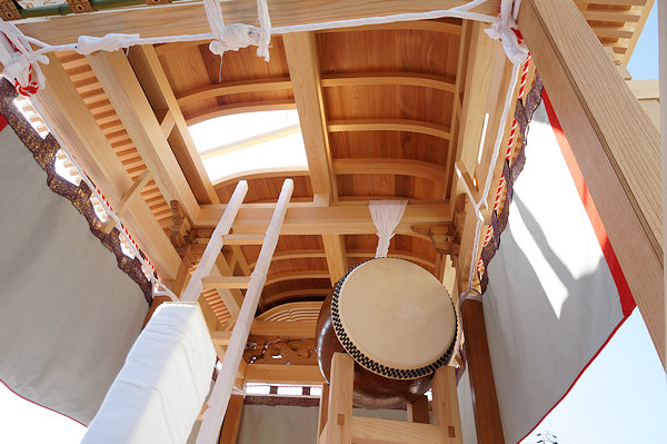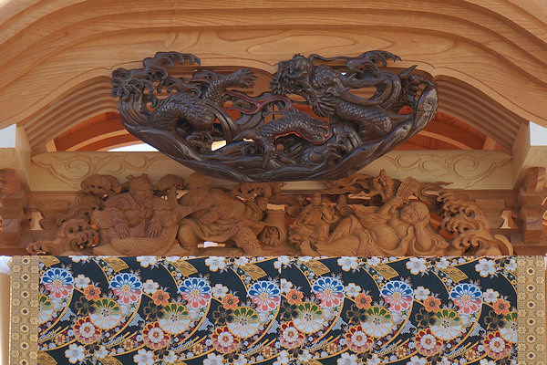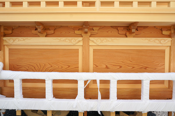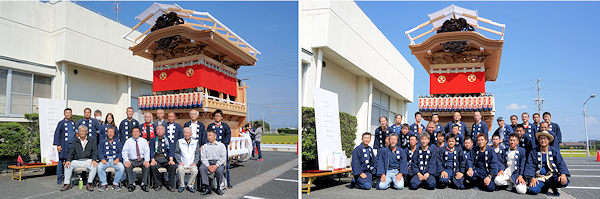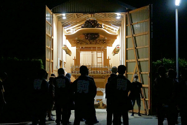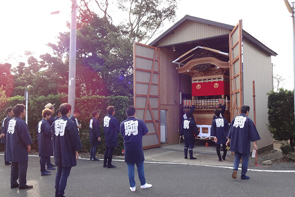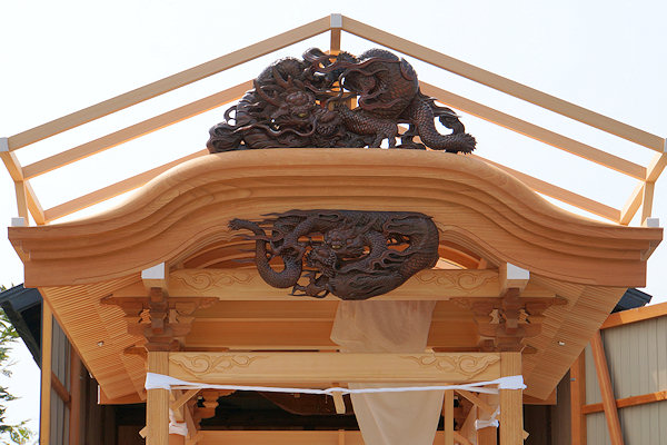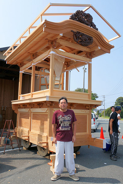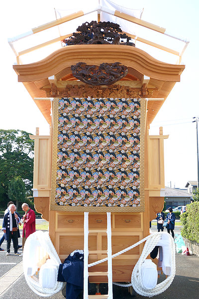駒場公民館に着いて撮影。外観的にはわかりにくいのですが旧屋台の部材を生かした新築修理。屋台の正面柱間口は5尺。屋台小屋に合わせたサイズです。前後の鬼板・懸魚と天幕は旧屋台から。前後の欄間2枚を三ケ日の伊藤さんで新調。来年には側面4枚が入ります。