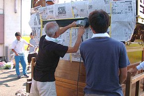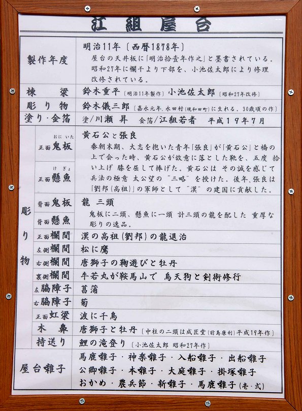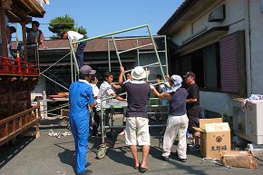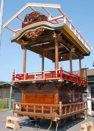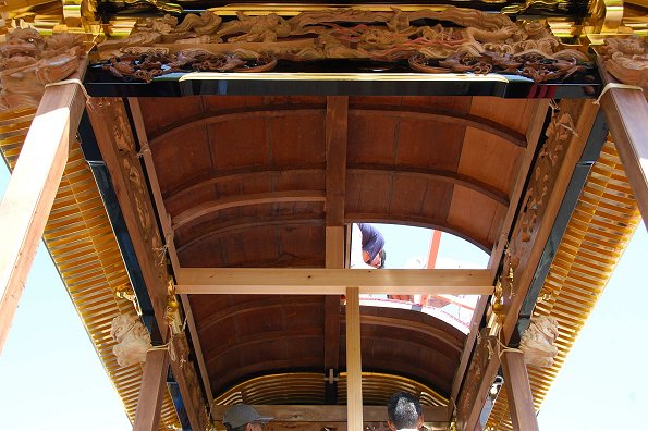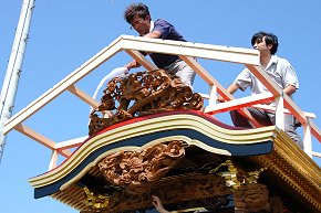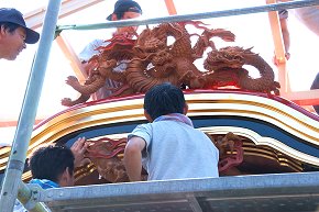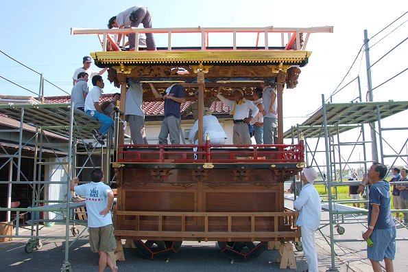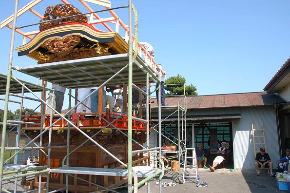 江口公民館前にて作業中。足場を組んで彫刻を取り付けるところです。第一印象は、想像以上の立派な屋台だ! ということ。とても自町で塗ったとは思えない綺麗な仕上がり。明治11年に造られた正面柱間口5尺の屋台は129年目を迎えて見事な姿になっています。